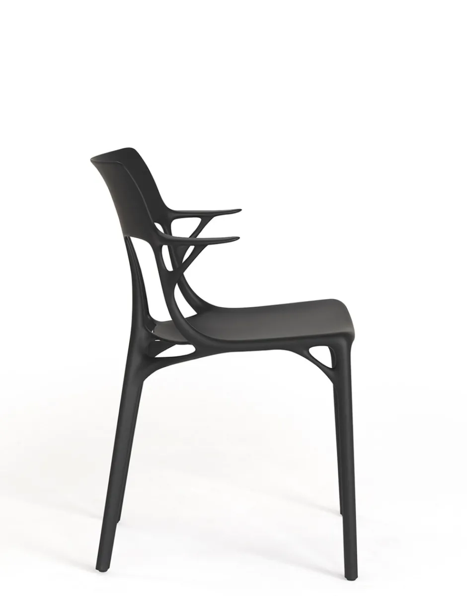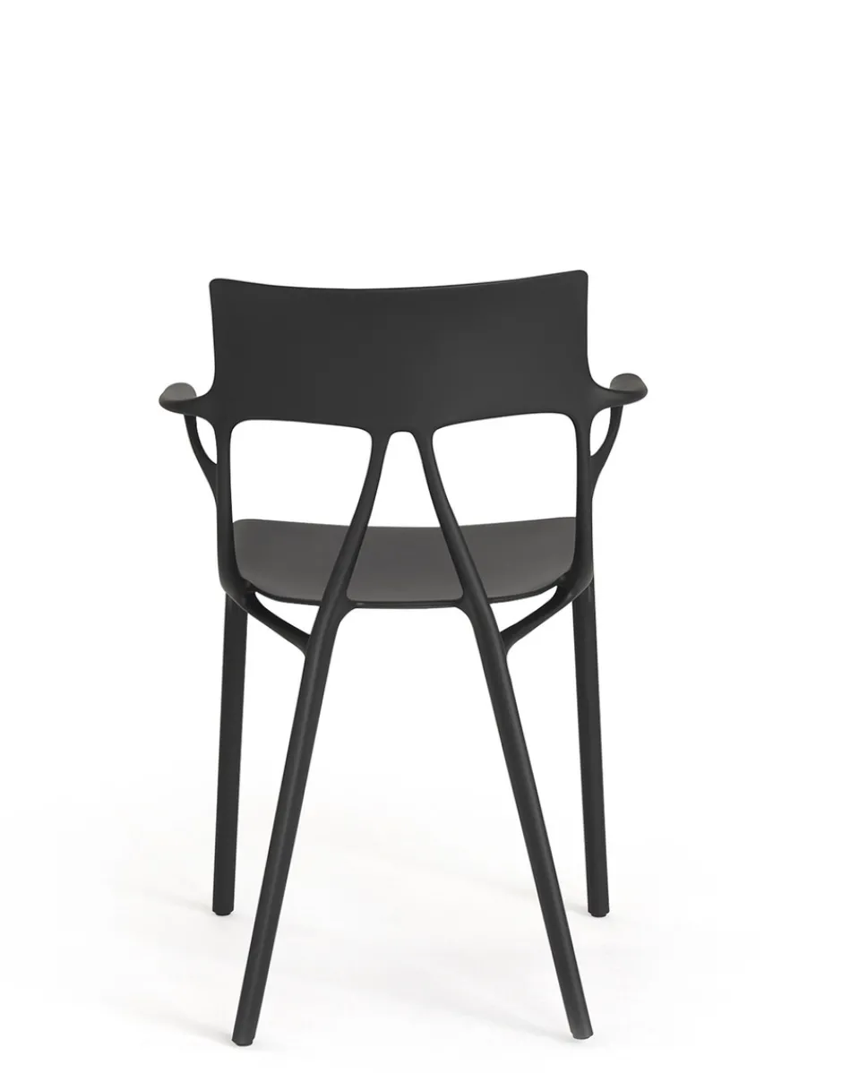 Kartell continua nel suo continuo impegno alla sostenibilità con prodotti eco-friendly che si inseriscono nell’ampio progetto espresso dal manifesto industriale Kartell loves the planet. A.I. è la sedia realizzata utilizzando per la prima volta materiale riciclato in cui qualità estetica e requisiti strutturali restano immutati e si coniugano al design generativo.Il valore aggiunto di A.I. consiste nell’essere la prima famiglia di prodotti concepita dall’Intelligenza Artificiale che ha risposto agli input ricevuti dal designer (Philippe Starck) e al know-how dall’azienda (Kartell). Nello specifico, pensiero creativo, know-how aziendale e intelligenza artificiale si sono fuse per concepire un modello di sedia totalmente elaborato da un algoritmo che rispetta le richieste originali del designer e dell’azienda ovvero essere un prodotto, confortevole, che abbia i requisiti strutturali di resistenza e solidità richiesti, mantenendo anche uno dei valori principali di Kartell: essere un prodotto industriale stampato ad iniezione di grande qualità estetica.