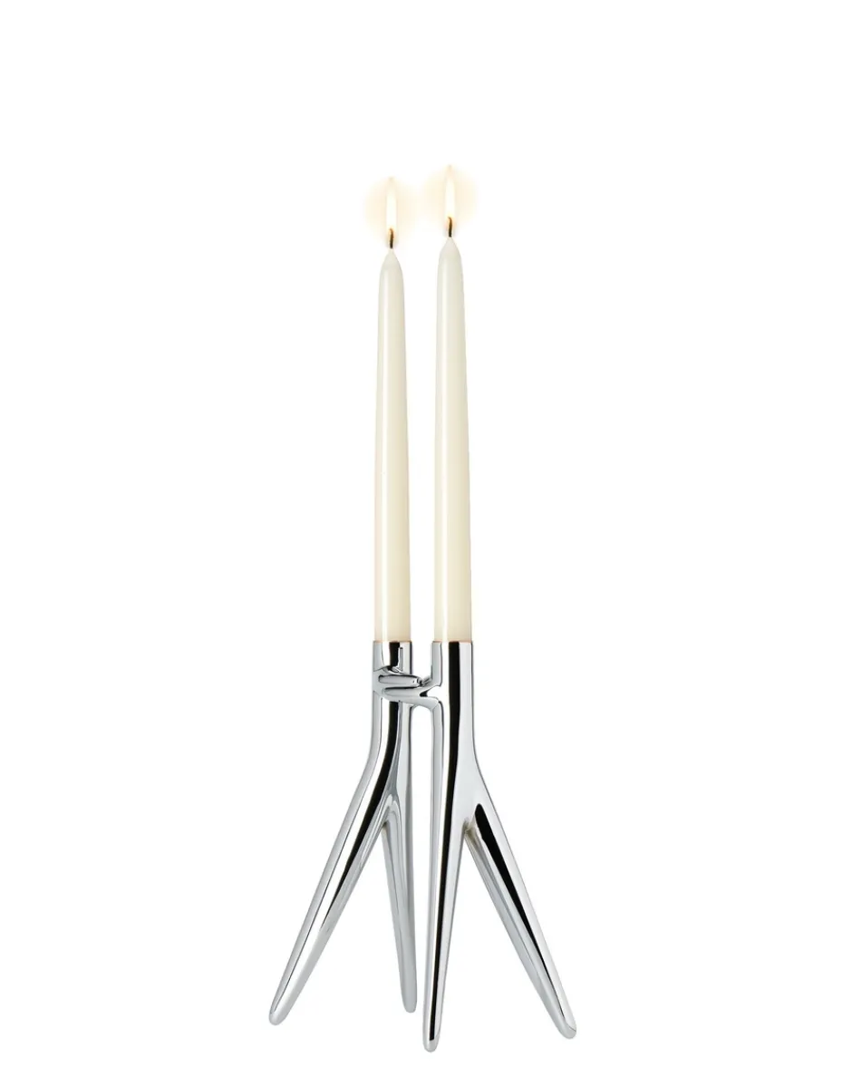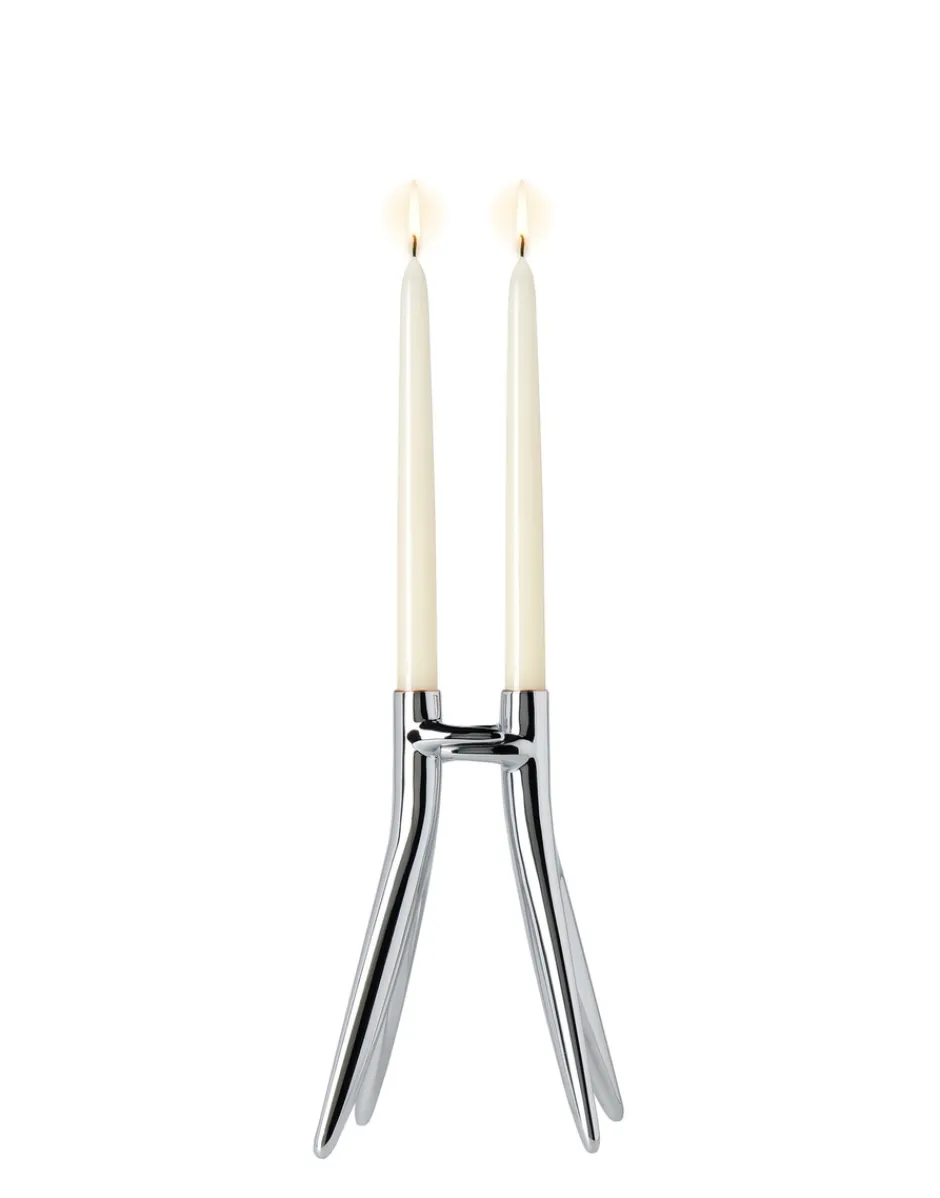 Abbracciaio è una fusione in alluminio di due sagome che, messe una di fronte all’altra, si trasformano in un abbraccio d’amore. Le due strutture che compongono il candelabro sono agganciate, in modo da permettere la stabilità dell’oggetto.