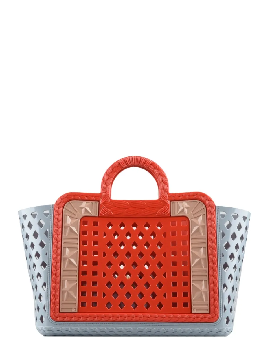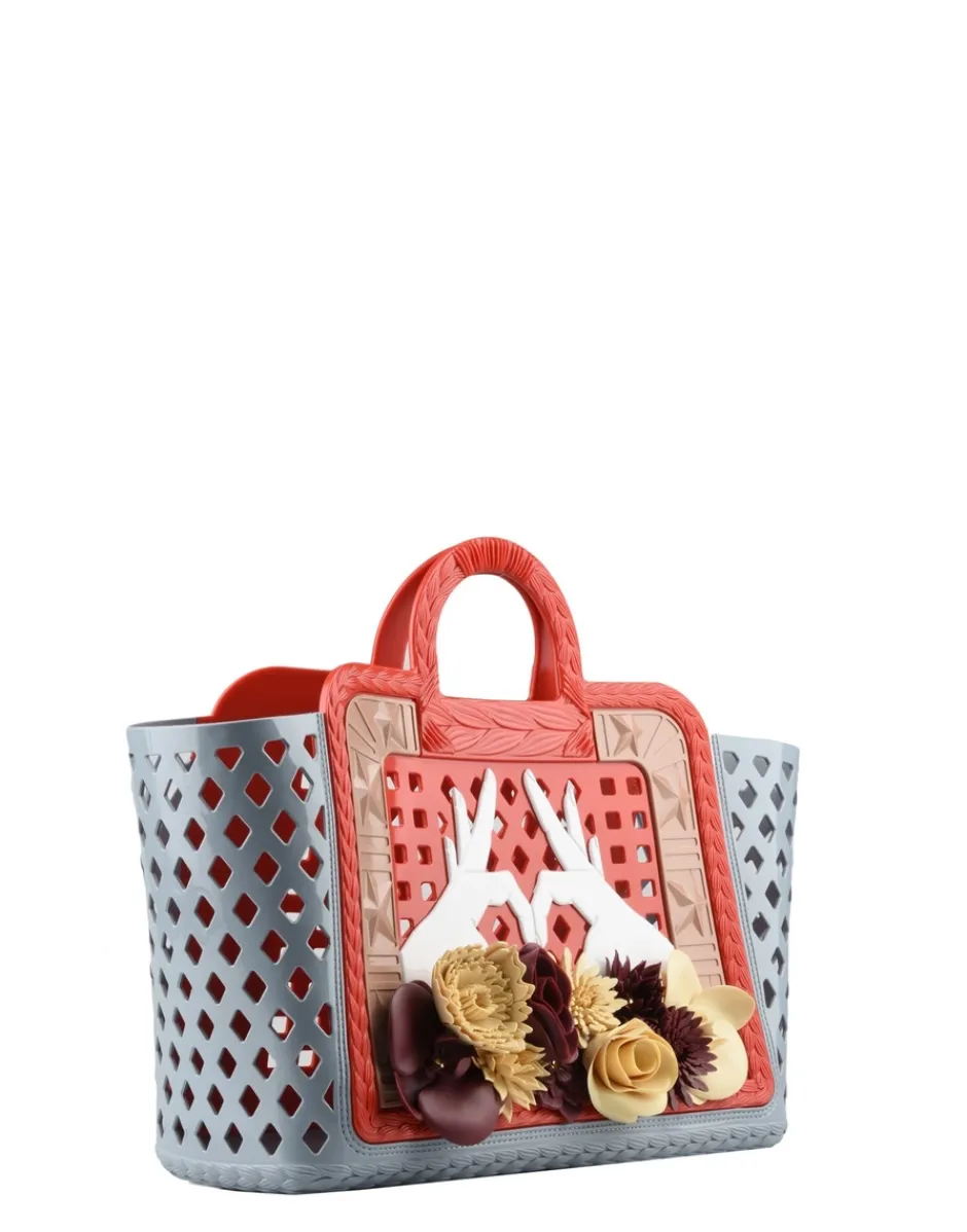 La borsa Parati è proposta in diverse combinazioni di colore. A lato, due mani unite a forma di cuore richiamano il tema dell’amore universale, mentre vere speciali riproduzioni di peonia, ranuncolo, orchidea, anemone e dalia di diverse forme e colori rimandano alle atmosfere lontane dei paesi esotici.