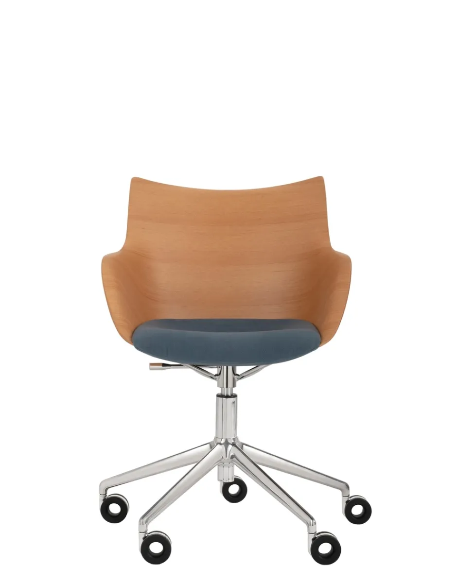 La famiglia di poltroncine si arricchisce della nuova versione girevole a rotelle. Q/wood è caratterizzata da una lavorazione unica del legno che unisce un’eleganza senza tempo a forme contemporanee ed è disponibile in tre varianti di colore: legno chiaro con seduta bianca e struttura cromo; legno scuro con seduta nera e struttura cromo e in legno scuro nero con struttura nera.