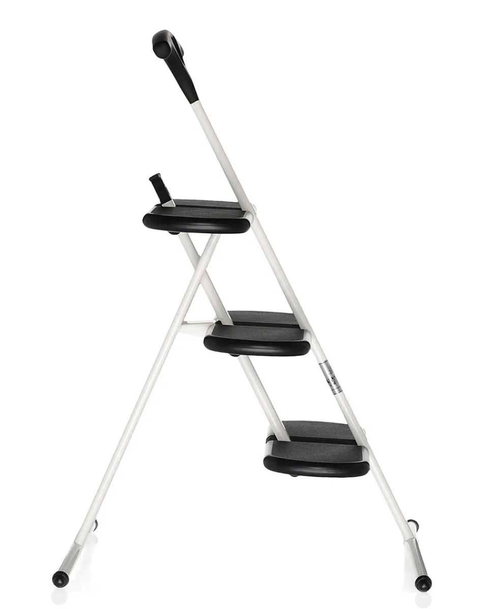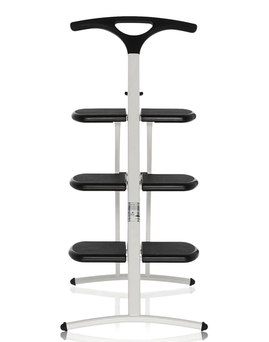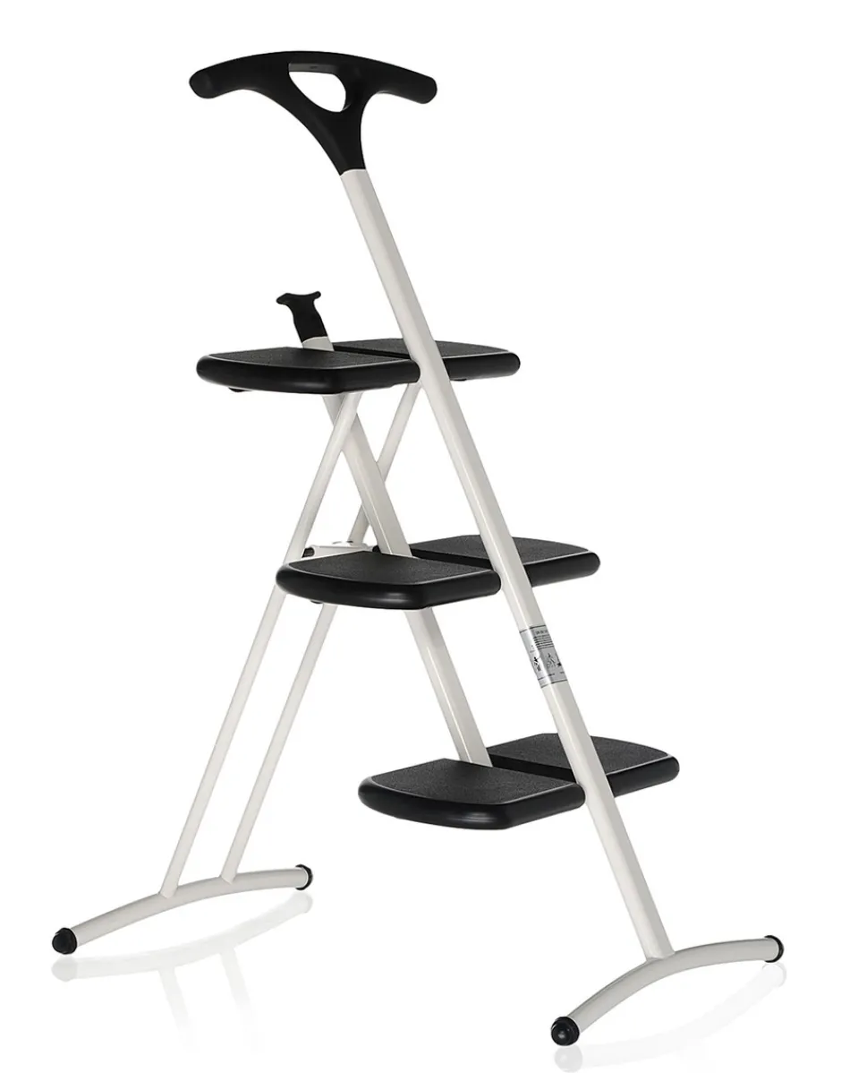 Una funzionale scaletta pieghevole a tre gradini con finitura antiscivolo. Tiramisù evidenzia la leggerezza del disegno nella struttura portante: le barre curvate offrono l’appoggio a terra e trovano nella maniglia non solo un robusto elemento di appoggio durante l‘uso, ma anche un pratico strumento funzionale una volta terminato l’utilizzo – grazie al suo design infatti è possibile agganciare Tiramisù a muro.