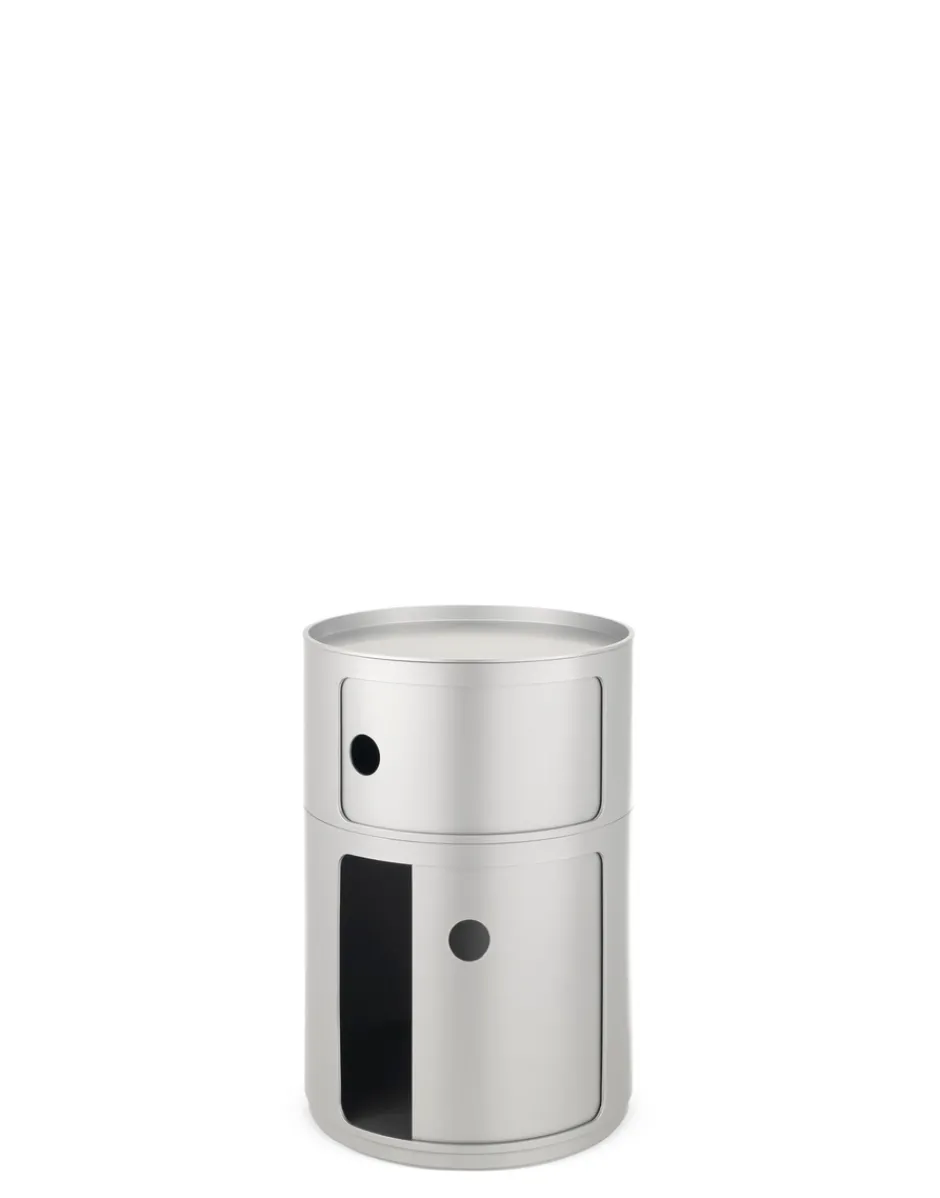 Gli elementi componibili sono stati progettati per rispondere a diverse esigenze d’uso e vivere in ogni ambiente della casa. La soluzione progettuale che anima il sistema Componibili è l’elementare e solida sovrapposizione verticale dei singoli pezzi che, tramite semplice incastro, vanno a comporre pratici mobili contenitori. Proposti in forma rotonda (diametro 42 cm) e quadrata (38x38cm), i Componibili possono poggiare su rotelle. Flessibili, funzionali, pratici, i Componibili nati nel 1967 sono un classico senza tempo dell’arredamento.