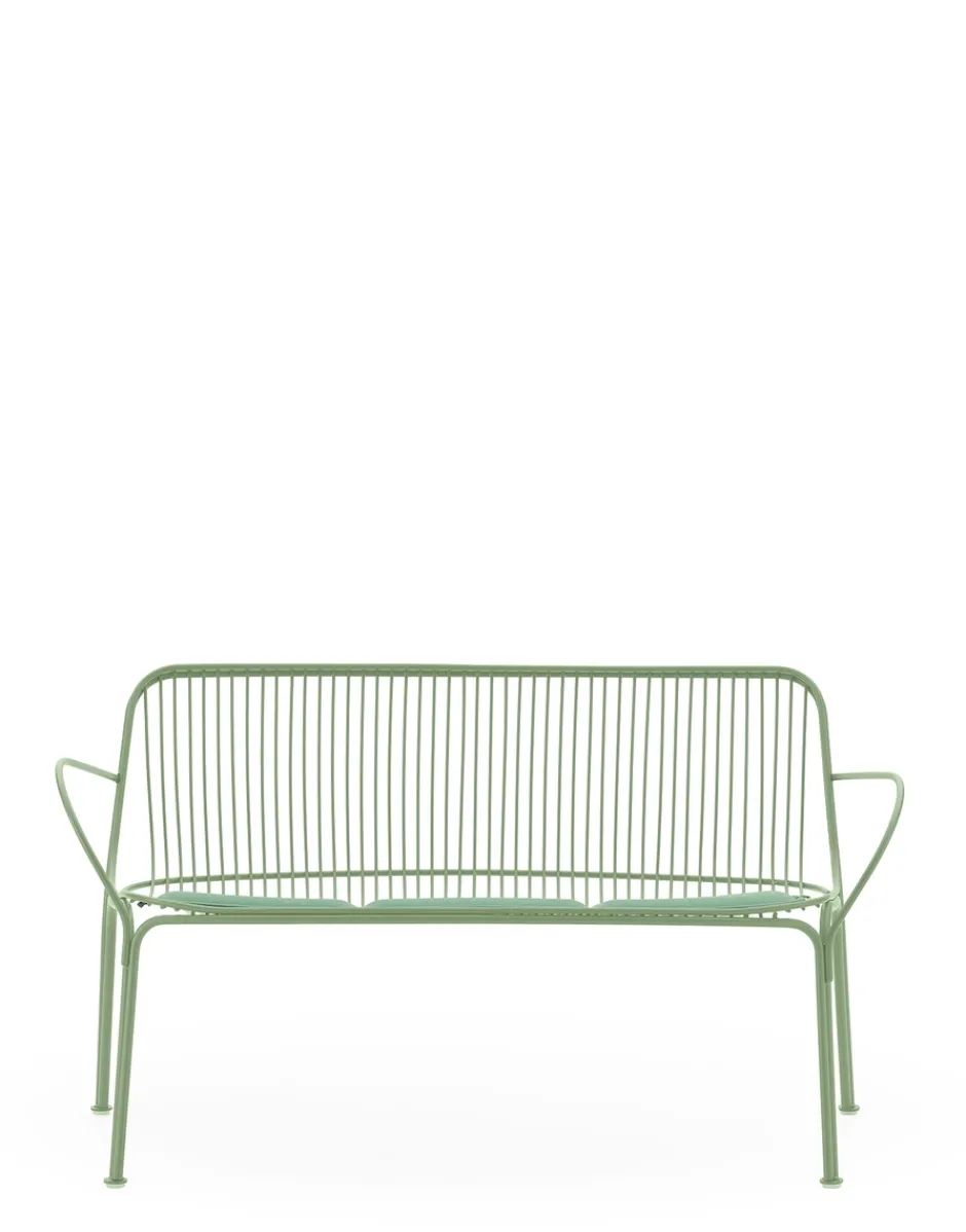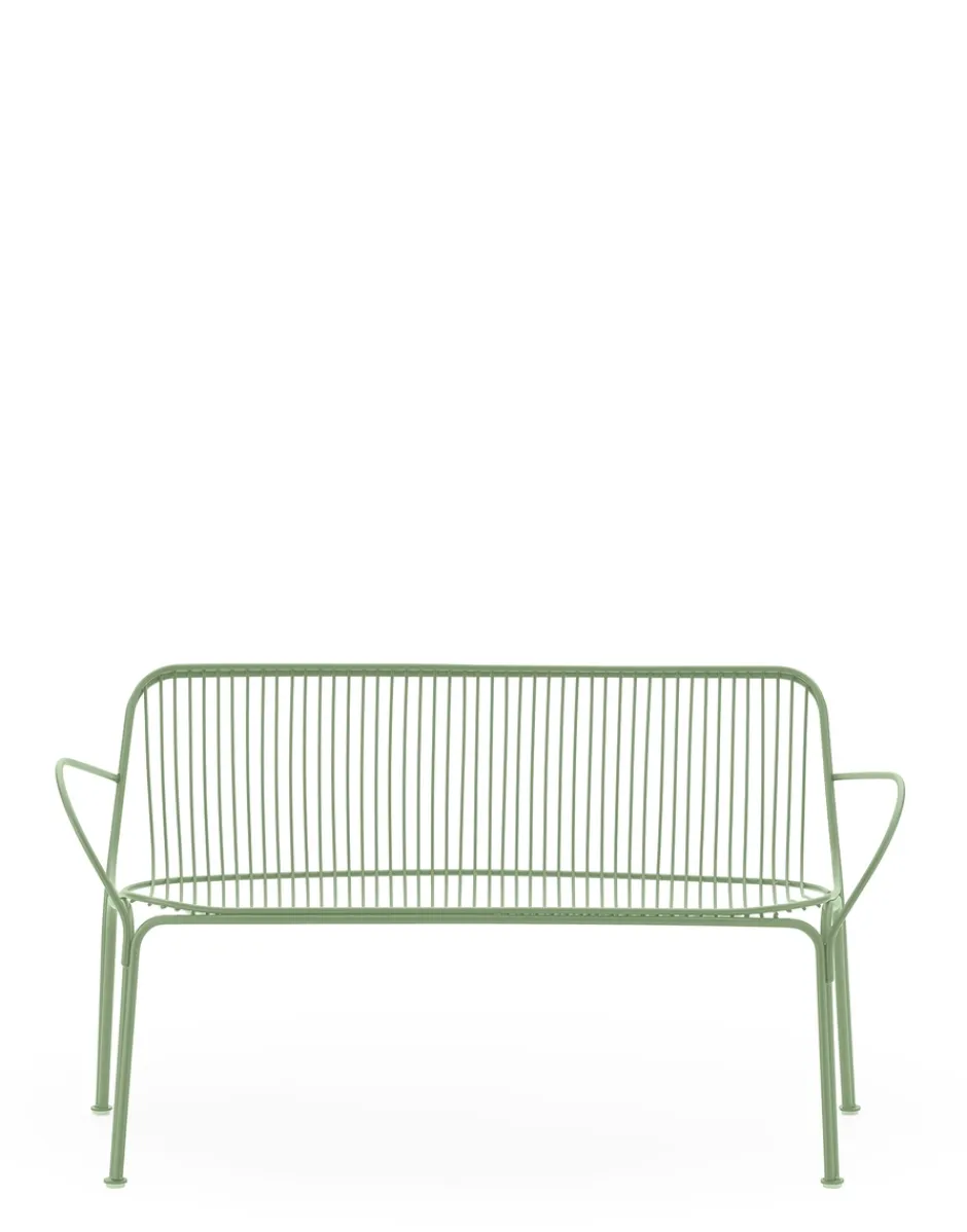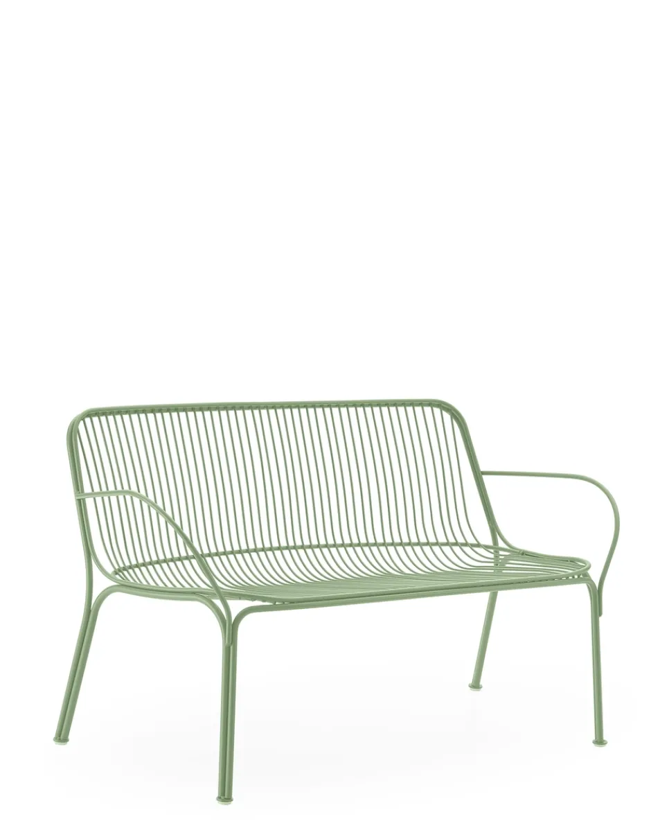 HIRAY gioca con il metallo, tra i materiali piùimportanti nella ridefinizione green del catalogo Kartell, lavorandolo con la tecnica del filo saldato. Il risultato è un segno essenziale e funzionalista e allo stesso tempo intriso di emozione. I fili di metallo disegnano pezzi dalla struttura ben definita ma leggera: sedia, sedia con braccioli, tavolino bistrot, poltrona, divano e side table. I colori della collezione sono bianco, bordeaux, nero e verde.
