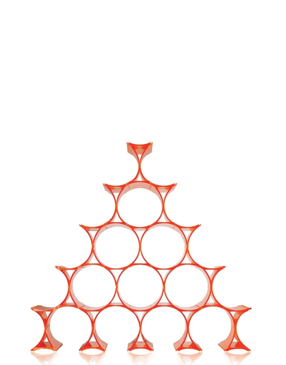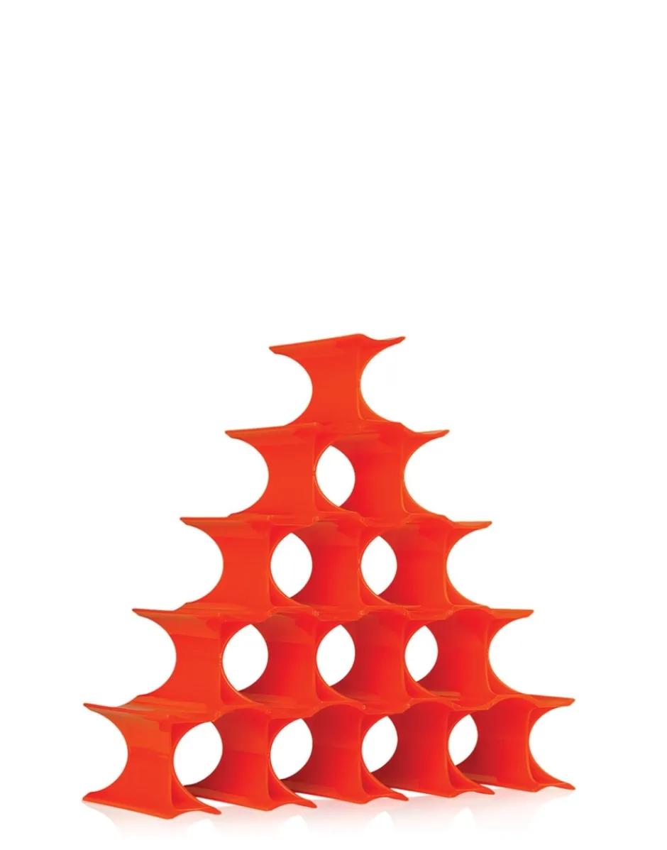 Infinity è un portabottiglie colorato, curvilineo e componibile. Gli elementi che formano il portabottiglie si possono agganciare tra loro per formare un numero indefinito di cerchi all’interno dei quali si possono riporre le bottiglie.