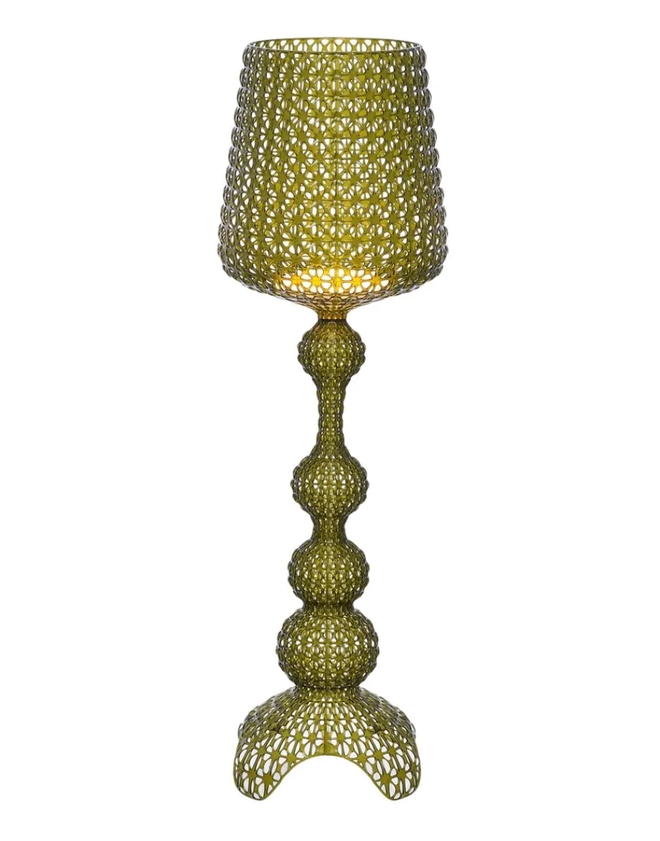La lampada a piantana Kabuki è realizzata ad iniezione che consente di avere una struttura a trama che riproduce il pizzo con una particolare superficie traforata da cui si diffonde la luce. Disponibile nelle versioni indoor e outdoor.