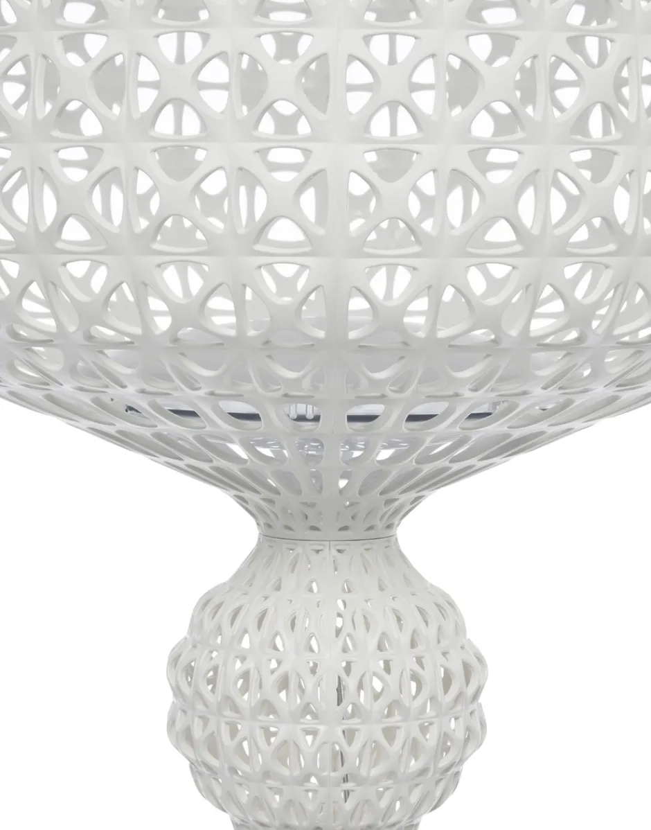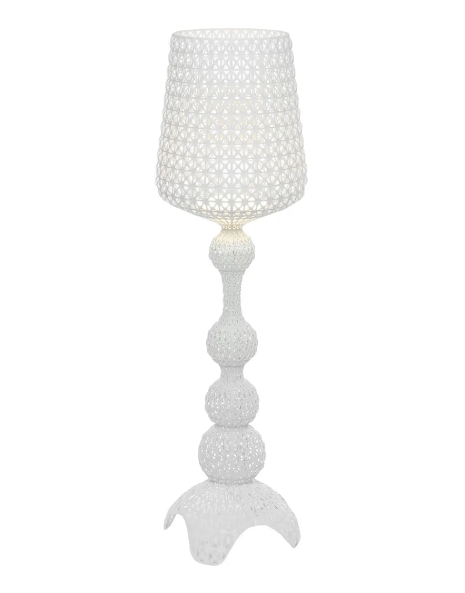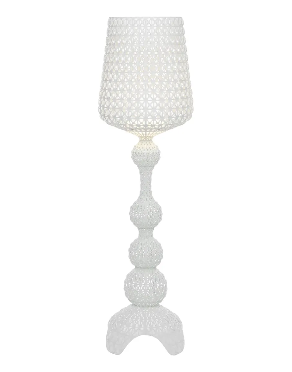 La lampada a piantana Kabuki è realizzata ad iniezione che consente di avere una struttura a trama che riproduce il pizzo con una particolare superficie traforata da cui si diffonde la luce. Disponibile nelle versioni indoor e outdoor.
