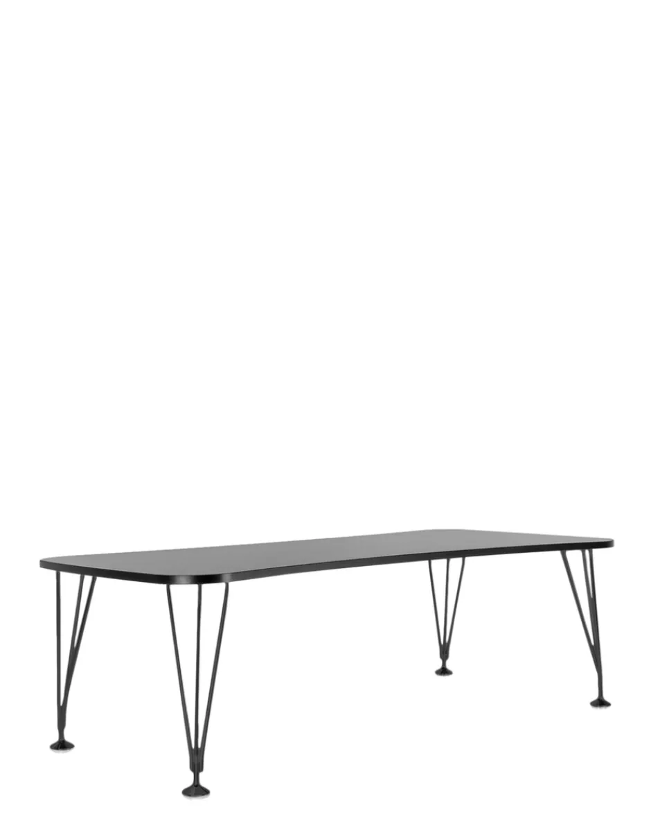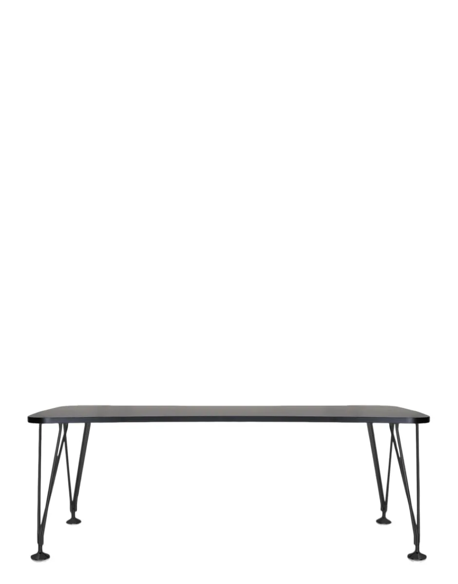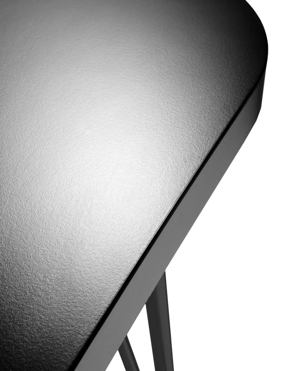 Un tavolo scrivania nato per l’ufficio. La morbida forma simile ad una clessidra consente di comporre un insieme fra più tavoli dello stesso tipo e di unire alla composizione anche altri elementi. Può vivere da solo come singola postazione di lavoro o insieme ai suoi simili per creare delle isole se inserito in open space. Le gambe sono composte da tre tubolari metallici che si riuniscono alla base terminando su ruote o su piedi. Le ruote sono anche dotate di freno autobloccante per assicurare la stabilità.