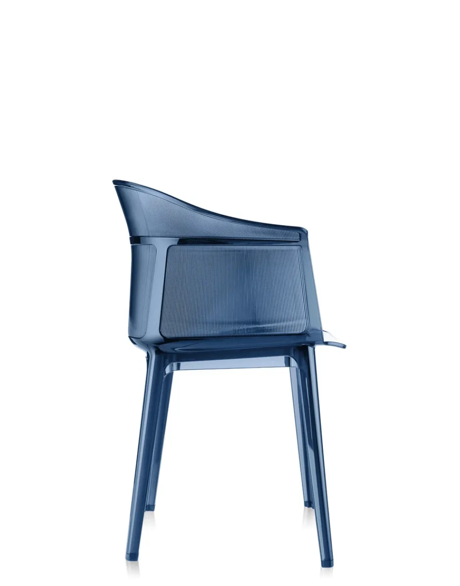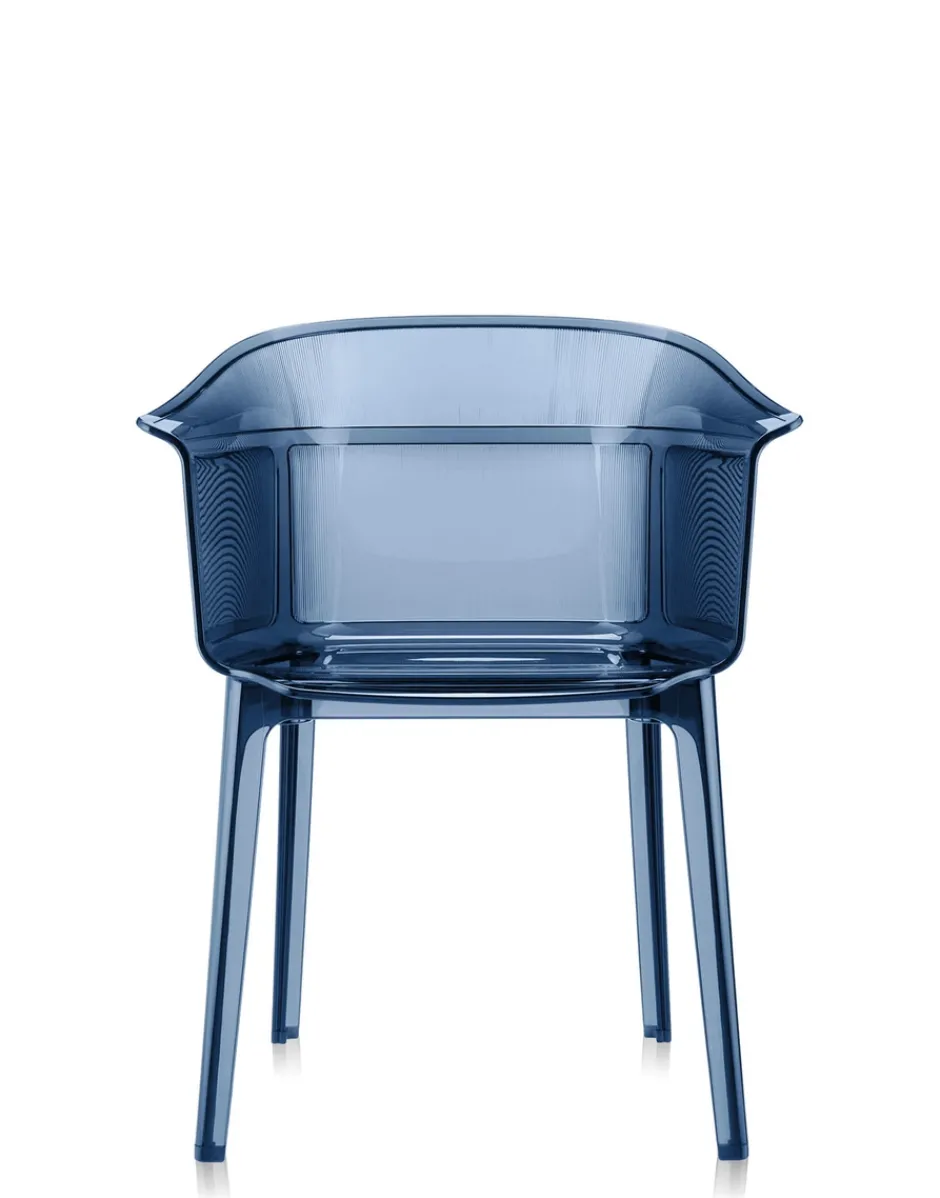 Papyrus si rifà all’archetipo delle vecchie sedie in midollino, quando la struttura aveva il tratto deciso e molto segnato. La poltroncina abbina alla parte di sostegno traslucida una sottilissima zigrinatura verticale, che ripercorre l’esterno dello schienale arrotondato, dalle forme morbide e avvolgenti.