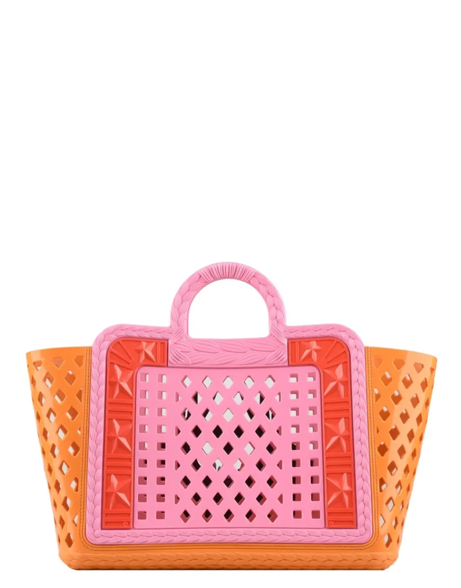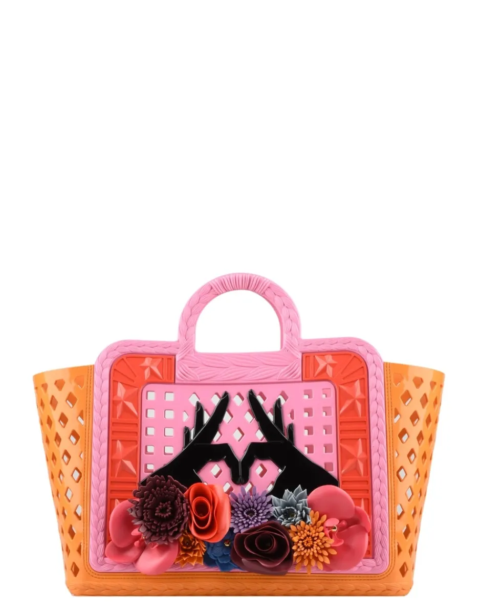 La borsa Parati è proposta in diverse combinazioni di colore. A lato, due mani unite a forma di cuore richiamano il tema dell’amore universale, mentre vere speciali riproduzioni di peonia, ranuncolo, orchidea, anemone e dalia di diverse forme e colori rimandano alle atmosfere lontane dei paesi esotici.