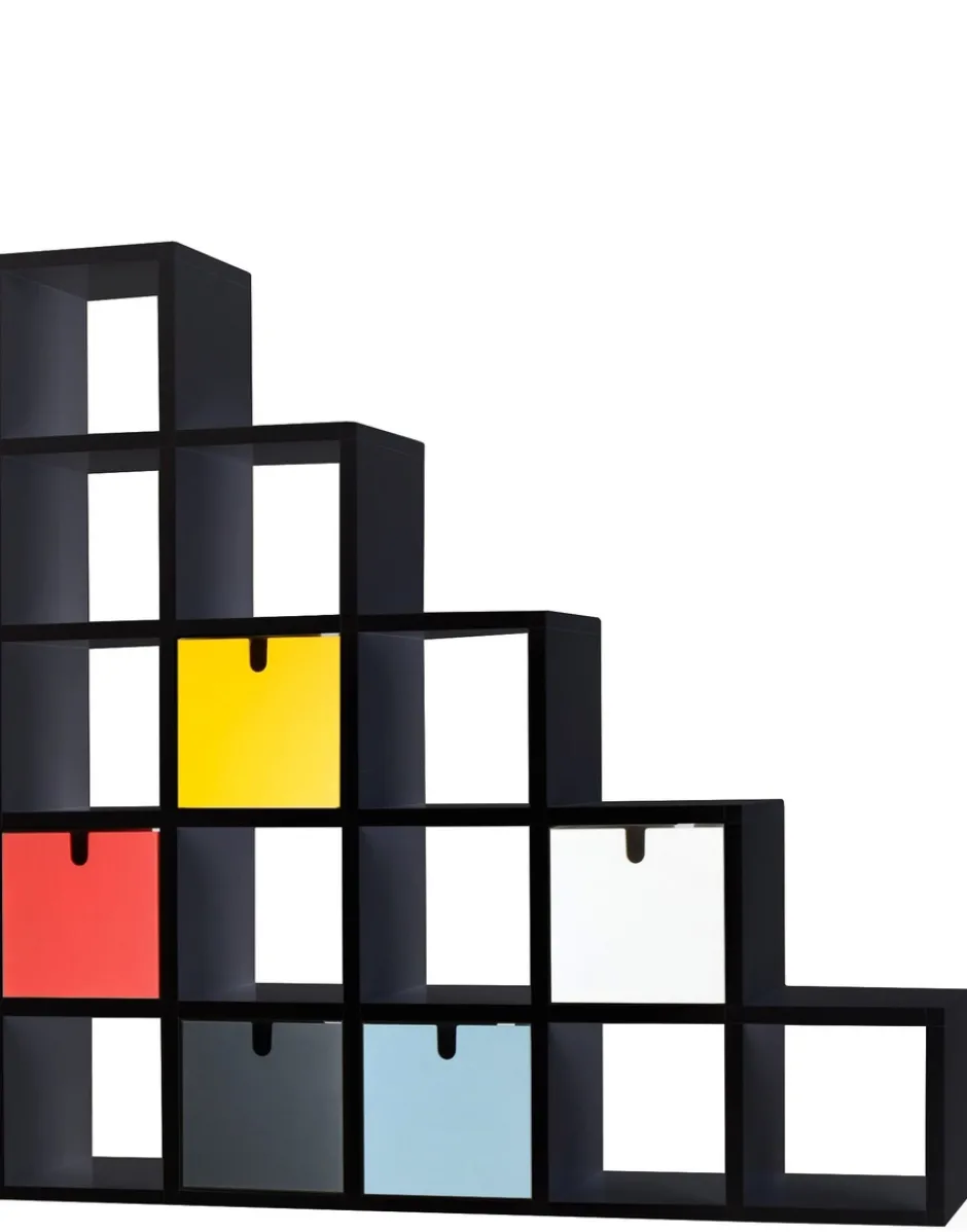 Polvara è la storica libreria modulabile che è possibile configuare a seconda delle esigenze abitative. Polvara è completata da cassetti in differenti colori che creano composizioni sempre diverse.