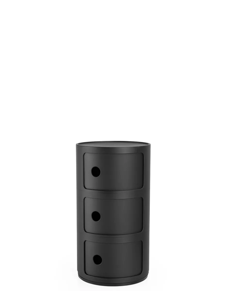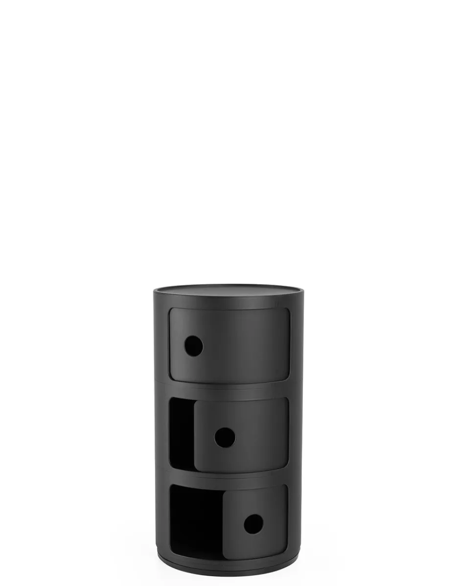 Il Componibile, grande best seller del marchio, disponibile anche nella versione bianca e nera opaca per un’ulteriore veste di uno dei prodotti più famosi e identitari di Kartell che da oltre 50 anni popola le case di tutto il mondo. Oggetto funzionale realizzato in finiture moderne e attuali. La nuova edizione è in materiale riciclato derivante da scarti industriali e conserva le medesime caratteristiche di resistenza e funzionalità della versione originale. Disponibile con struttura fissa non sovrapponibile a due o tre elementi con diamtro da 32cm. Finitura mat effetto soft touch.