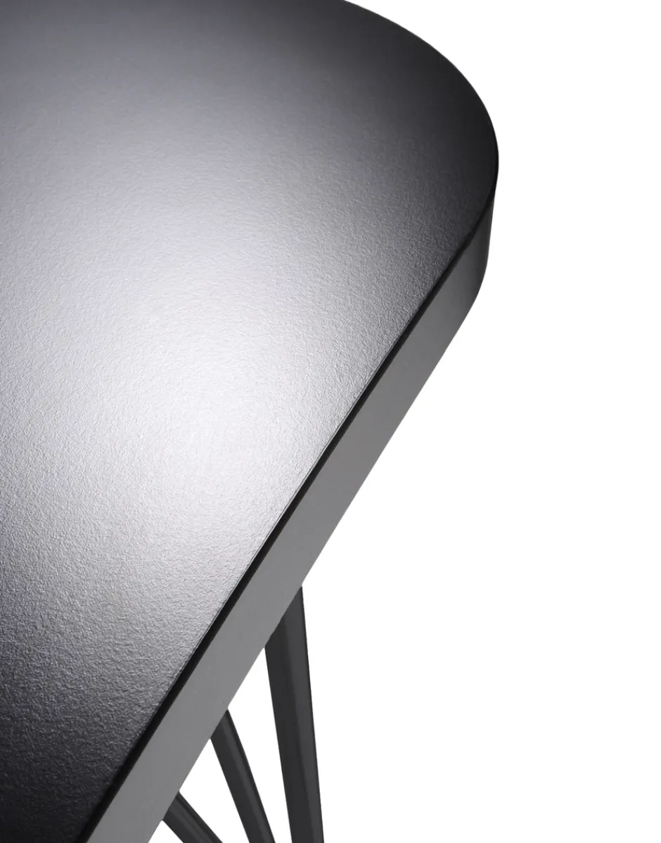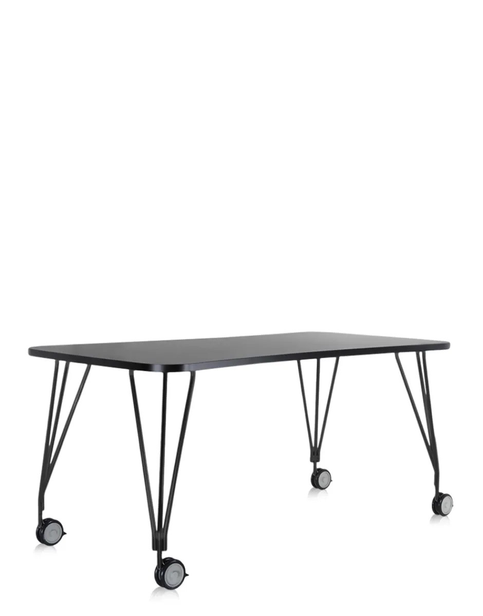 Un tavolo scrivania nato per l’ufficio. La morbida forma simile ad una clessidra consente di comporre un insieme fra più tavoli dello stesso tipo e di unire alla composizione anche altri elementi. Può vivere da solo come singola postazione di lavoro o insieme ai suoi simili per creare delle isole se inserito in open space. Le gambe sono composte da tre tubolari metallici che si riuniscono alla base terminando su ruote o su piedi. Le ruote sono anche dotate di freno autobloccante per assicurare la stabilità.