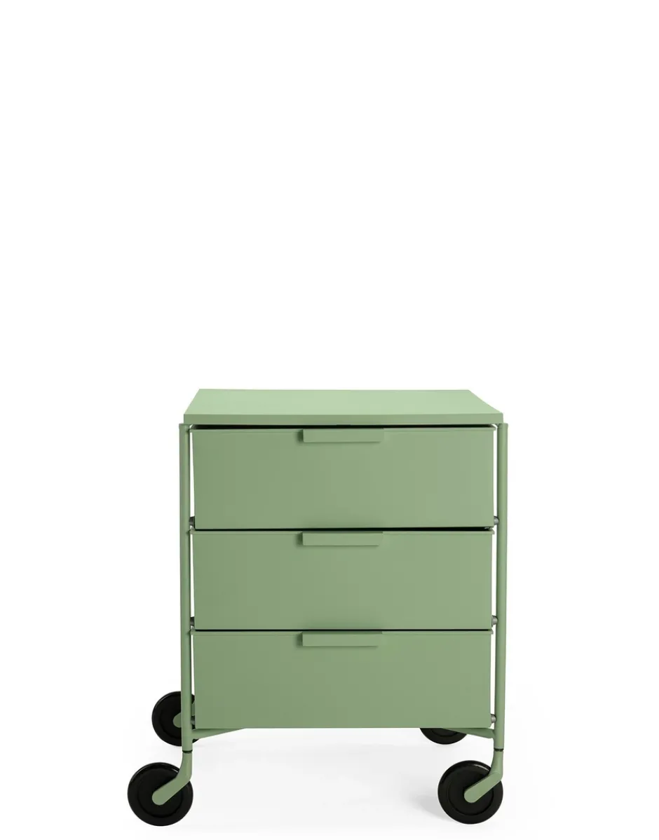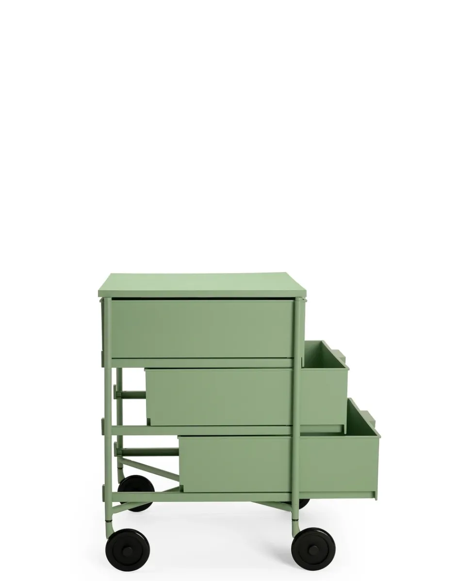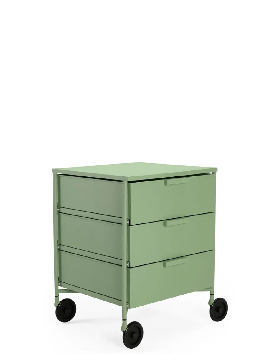 Vincitrice del Compasso d’Oro nel 1994, la cassettiera Mobil viene presentata in versione mat nei colori bianco, nero, verde, prugna e azzurro. La nuova edizione è in materiale riciclato derivante da scarti industriali e conserva le medesime caratteristiche di resistenza e funzionalità della versione originale. L’elemento base del sistema è il cassetto, alternato ai piani e ai top superiori, collegati da una struttura in alluminio. In questa nuova finitura la struttura è colorata e sono colorate anche le ruote in nero non più grigie. Versatile nella sua funzione uscendo dall’uso office trova un suo impiego in tutti gli ambienti della casa, dalla camera da letto al soggiorno al bagno.
