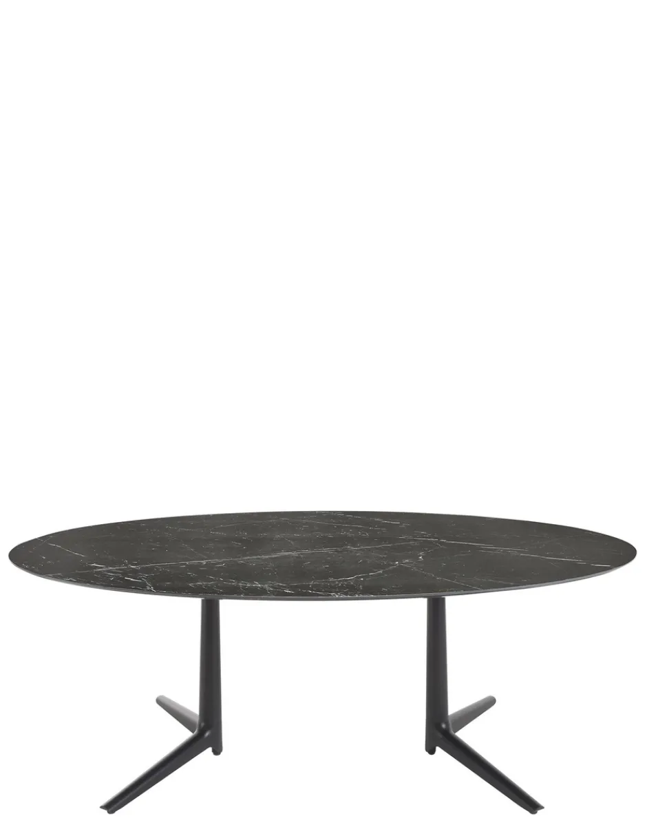Multiplo è un’ampia famiglia di tavoli, trasversale nei suoi impieghi, e pensata per consentire la personalizzazione giocando sulle forme (quadrata stondata, tonda e ovale) e l’abbinamento di basi (base centrale, a due, tre o quattro razze) e piani (in gres tinta unita o finitura marmo e vetro).