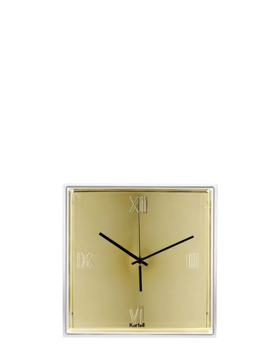Una “scatola” quadrata trasparente, di misura 30×30 cm, con i numeri romani incisi sulla superficie che racchiude un quadrante piatto, su cui spicca una coppia di sottili lancette colorate, per una sintesi cromatica che trasforma il tempo in un’esperienza estetica.