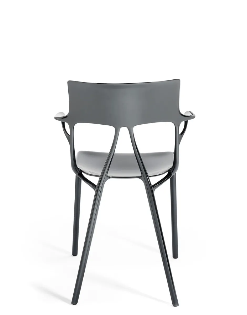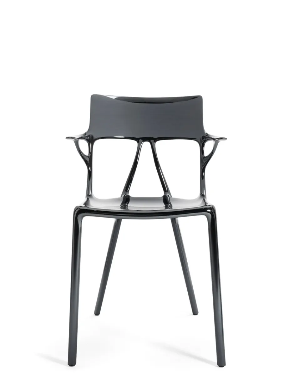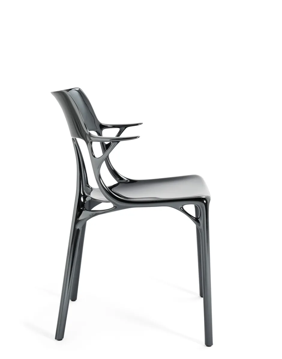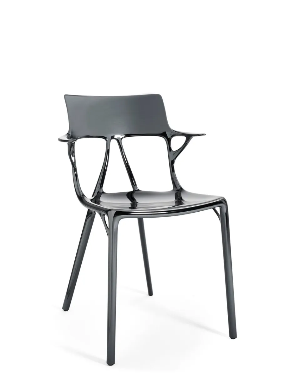 A.I. Metal è la nuova versione metallizzata della sedia realizzata utilizzando per la prima volta materiale riciclato in cui qualità estetica e requisiti strutturali restano immutati e si coniugano al design generativo. A.I. Metal è disponibile nelle seguenti varianti di colore: bronzo e titanio.Il valore aggiunto di A.I. consiste nell’essere la prima famiglia di prodotti concepita dall’Intelligenza Artificiale che ha risposto agli input ricevuti dal designer (Philippe Starck) e al know-how dall’azienda (Kartell). Nello specifico, pensiero creativo, know-how aziendale e intelligenza artificiale si sono fuse per concepire un modello di sedia totalmente elaborato da un algoritmo che rispetta le richieste originali del designer e dell’azienda ovvero essere un prodotto, confortevole, che abbia i requisiti strutturali di resistenza e solidità richiesti, mantenendo anche uno dei valori principali di Kartell: essere un prodotto industriale stampato ad iniezione di grande qualità estetica.