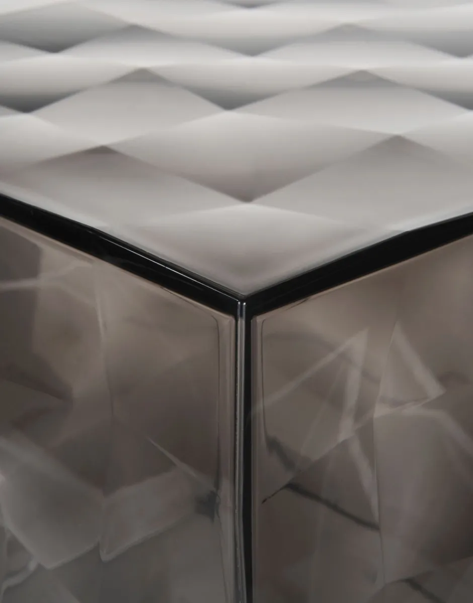 Optic è un cubo contenitore in due versioni, chiuso con antina o con un lato aperto, la superficie è decorata da piramidi a base quadrata, leggermente a rilievo che, con la superficie specchiante o trasparente, creano un effetto ottico di grande impatto.