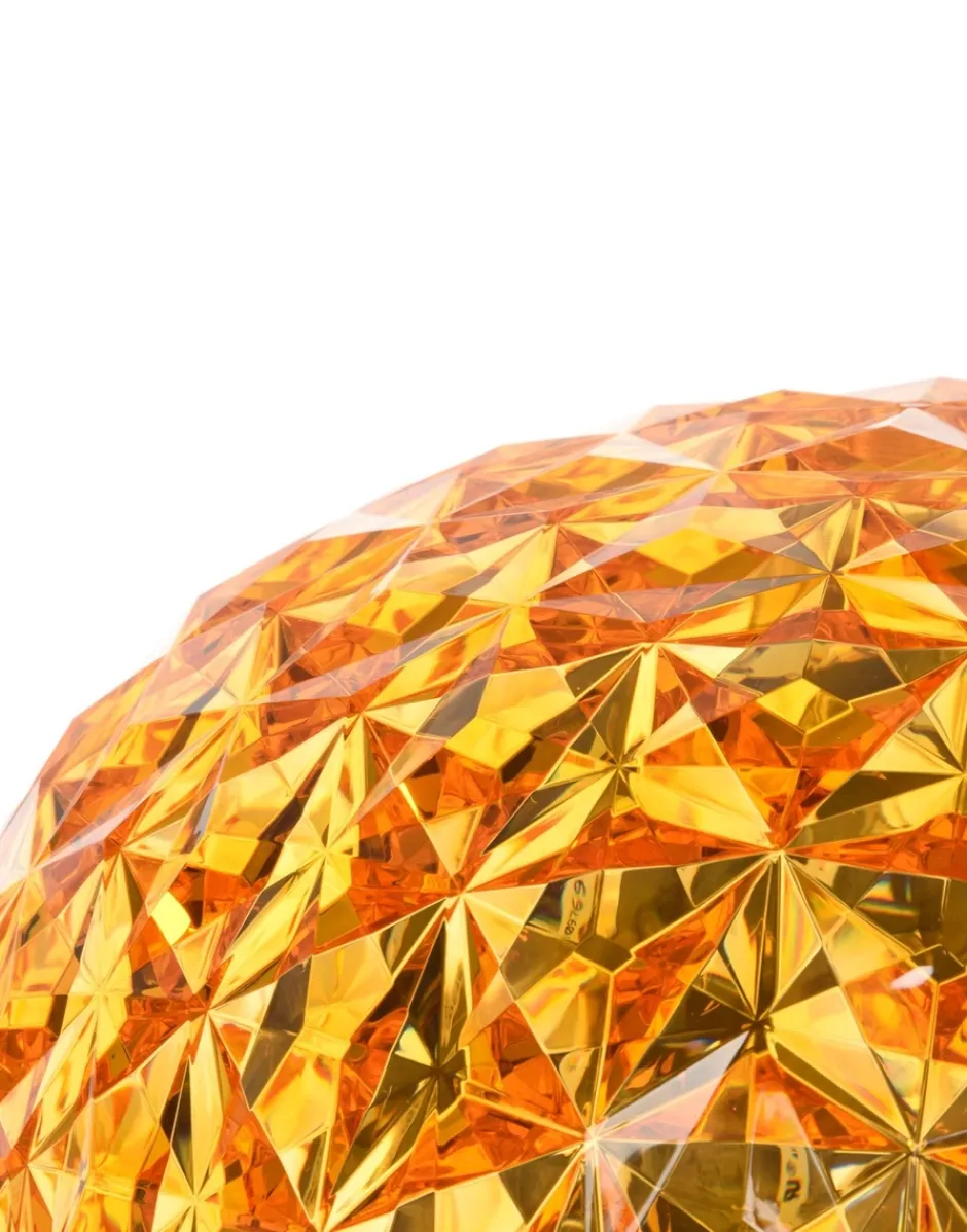Una famiglia completa di lampade: a sospensione, da tavolo bassa e con struttura in metallo e la più recente versione da terra disponibile nelle due altezze 130 e 160 cm. La particolarità è data dalla forma leggermente ovoidale del diffusore trasparente, caratterizzato da una superficie sfaccettata sia nella parte interna sia esterna che crea un ricco gioco di riflessi.