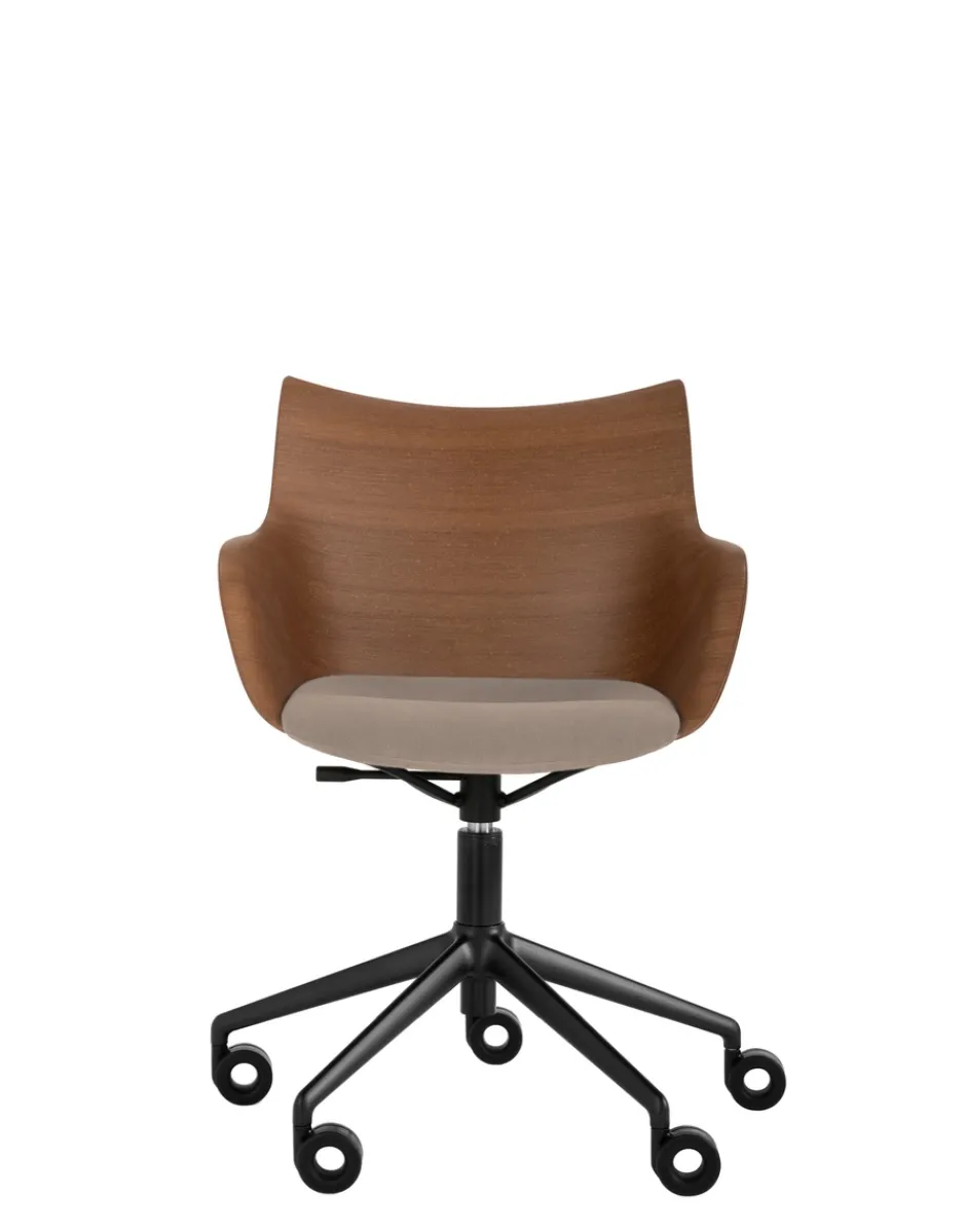 La famiglia di poltroncine si arricchisce della nuova versione girevole a rotelle. Q/wood è caratterizzata da una lavorazione unica del legno che unisce un’eleganza senza tempo a forme contemporanee ed è disponibile in tre varianti di colore: legno chiaro con seduta bianca e struttura cromo; legno scuro con seduta nera e struttura cromo e in legno scuro nero con struttura nera.