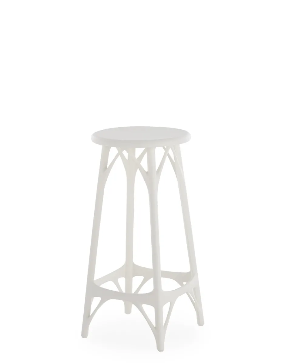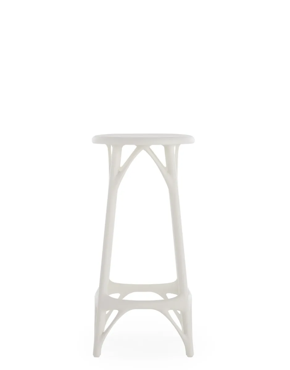Uno sgabello in materiale riciclato che punta tutto sulla sostenibilità del progetto. La seduta è sostenibile sia dal punto di vista del materiale sia nel processo produttivo, appositamente pensato per la massima ottimizzazione: da un solo stampo si riescono infatti a produrre tre modelli, nell’ottica di un approccio green che arriva al cuore della produzione industriale.Il valore aggiunto di A.I. consiste nell’essere la prima famiglia di prodotti concepita dall’Intelligenza Artificiale che ha risposto agli input ricevuti dal designer (Philippe Starck) e al know-how dall’azienda (Kartell). Nello specifico, pensiero creativo, know-how aziendale e intelligenza artificiale si sono fuse per concepire un modello di sedia totalmente elaborato da un algoritmo che rispetta le richieste originali del designer e dell’azienda ovvero essere un prodotto, confortevole, che abbia i requisiti strutturali di resistenza e solidità richiesti, mantenendo anche uno dei valori principali di Kartell: essere un prodotto industriale stampato ad iniezione di grande qualità estetica.