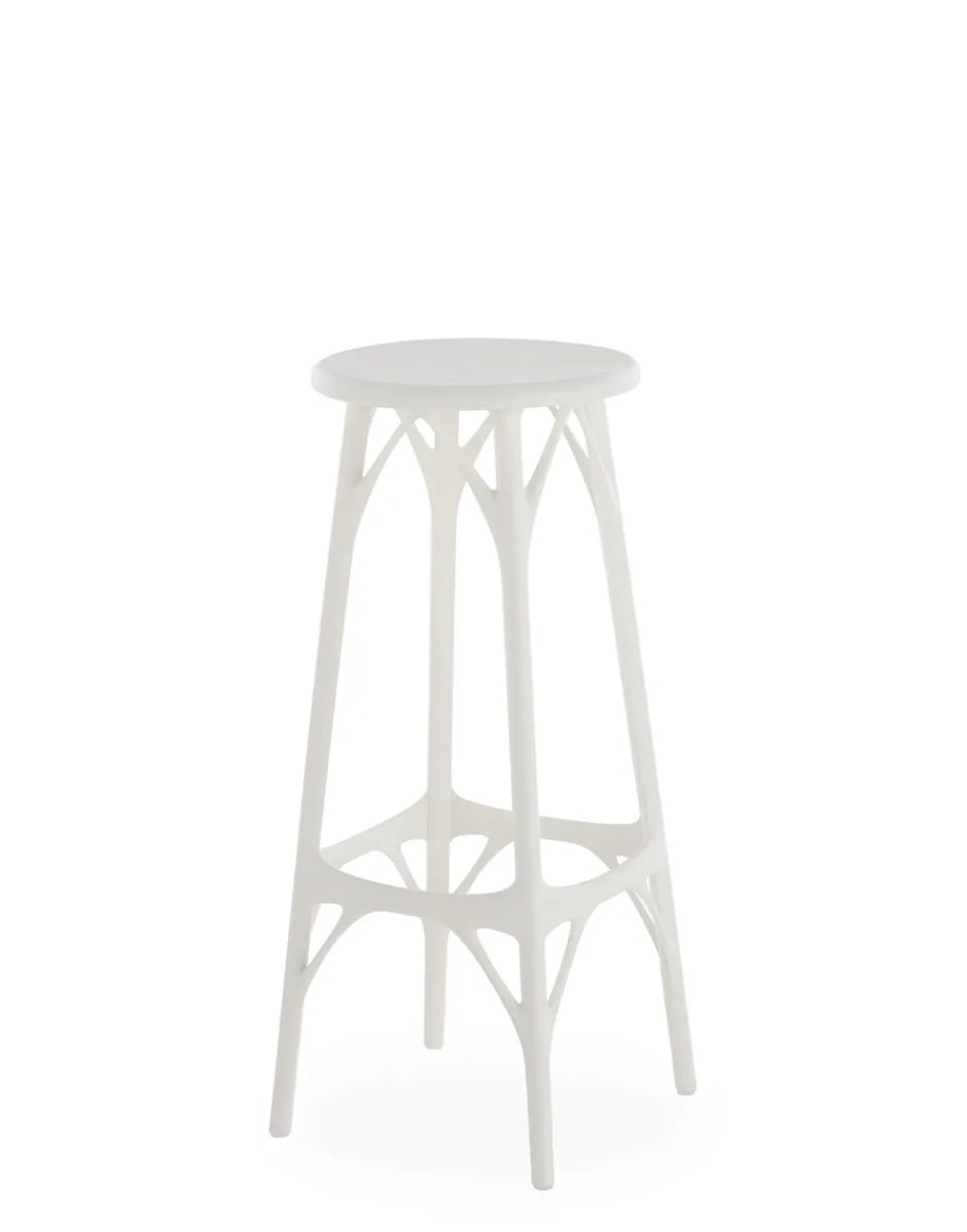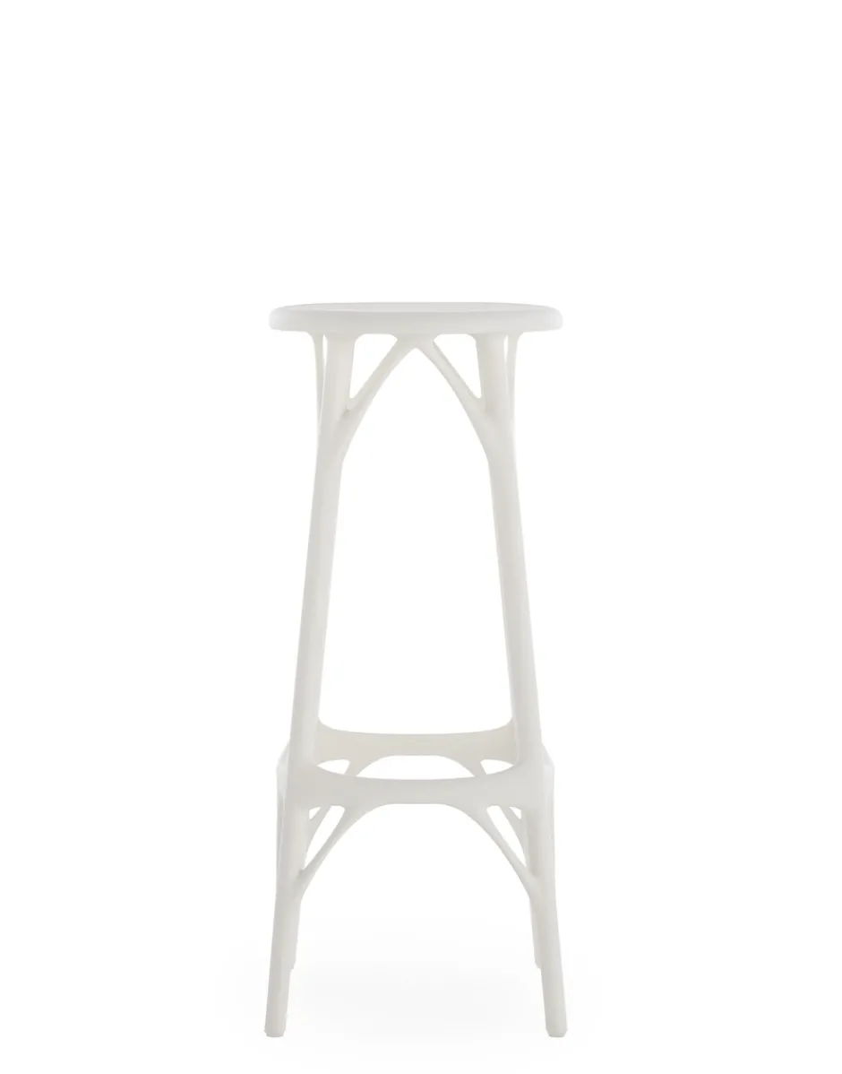 Uno sgabello in materiale riciclato che punta tutto sulla sostenibilità del progetto. La seduta è sostenibile sia dal punto di vista del materiale sia nel processo produttivo, appositamente pensato per la massima ottimizzazione: da un solo stampo si riescono infatti a produrre tre modelli, nell’ottica di un approccio green che arriva al cuore della produzione industriale.Il valore aggiunto di A.I. consiste nell’essere la prima famiglia di prodotti concepita dall’Intelligenza Artificiale che ha risposto agli input ricevuti dal designer (Philippe Starck) e al know-how dall’azienda (Kartell). Nello specifico, pensiero creativo, know-how aziendale e intelligenza artificiale si sono fuse per concepire un modello di sedia totalmente elaborato da un algoritmo che rispetta le richieste originali del designer e dell’azienda ovvero essere un prodotto, confortevole, che abbia i requisiti strutturali di resistenza e solidità richiesti, mantenendo anche uno dei valori principali di Kartell: essere un prodotto industriale stampato ad iniezione di grande qualità estetica.