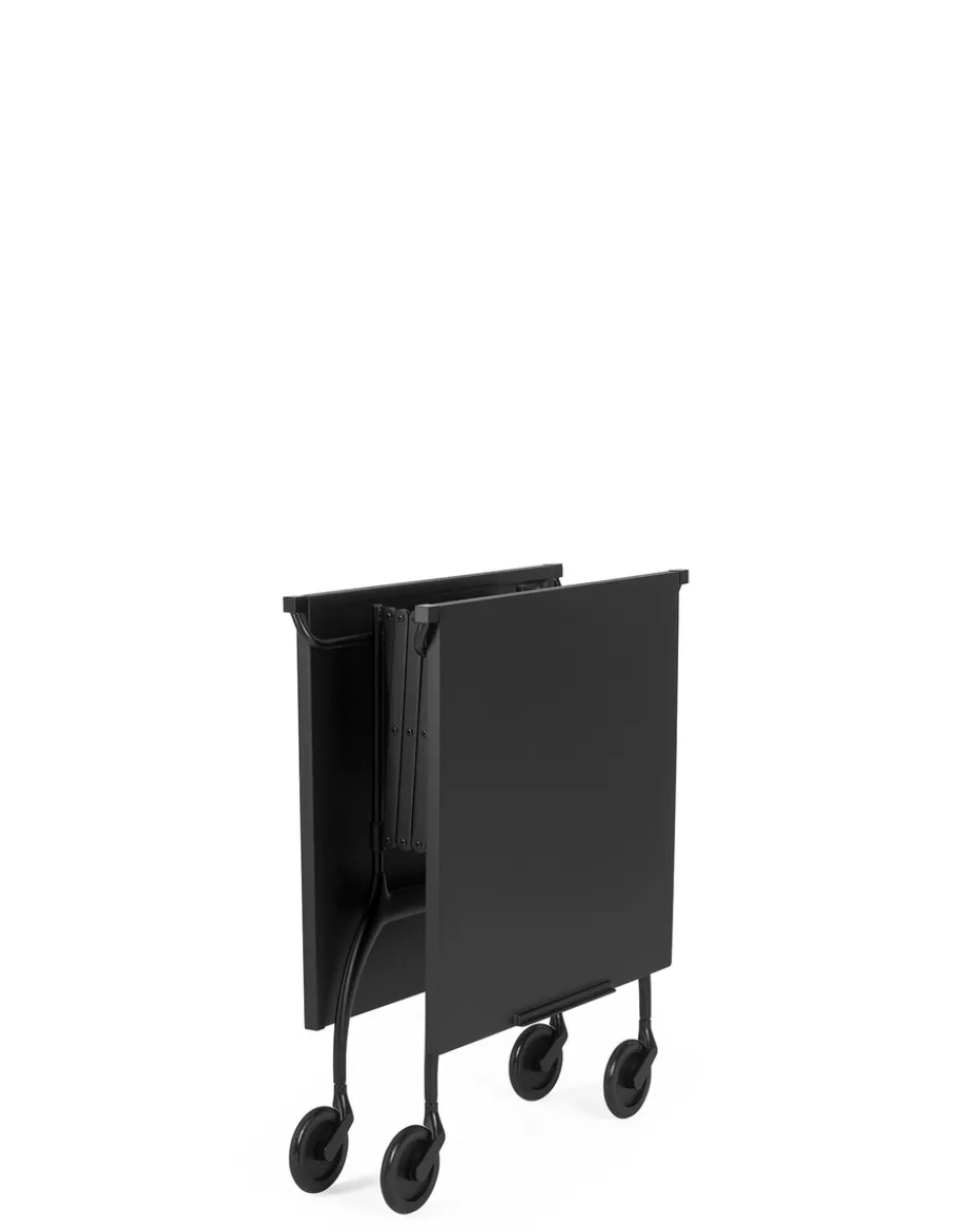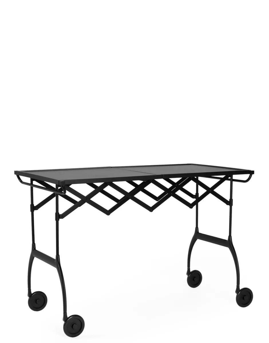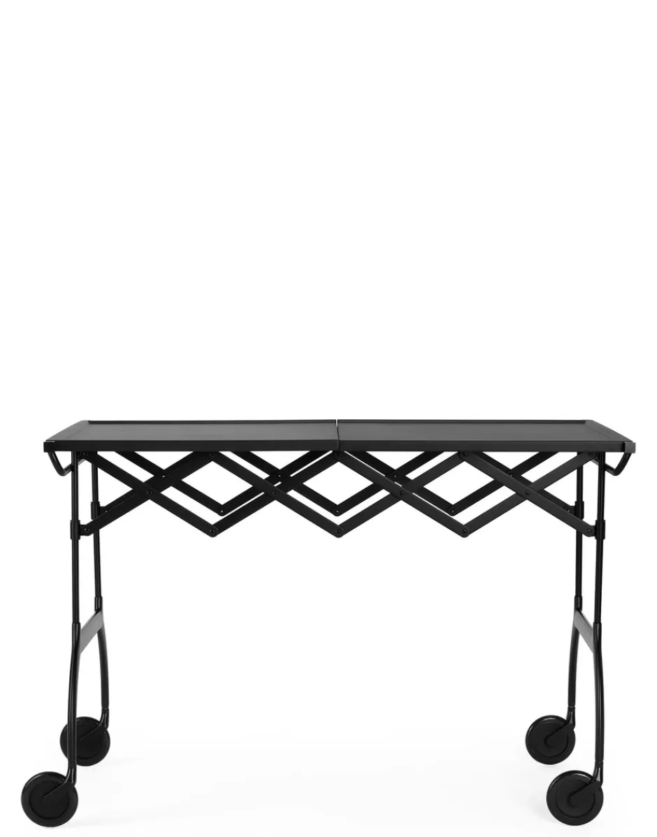 Battista, oltre ad essere un pratico carrello, caratterizzato dalla riuscita combinazione compositiva tra materiali plastici e metallo, si propone come vero e proprio tavolo allungabile e pieghevole ideale per buffet e aperitivi o come piccolo tavolo da appoggio.