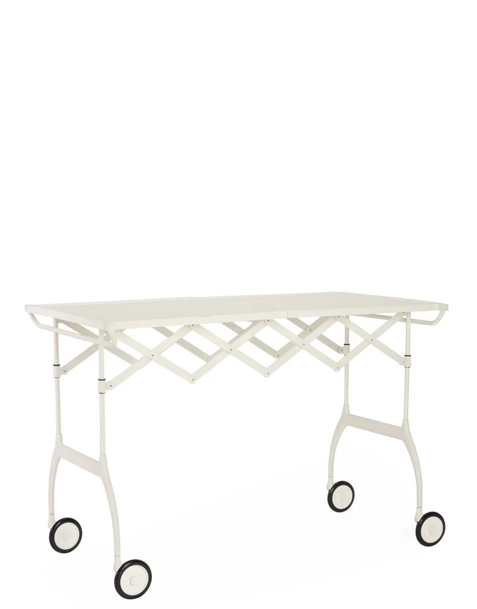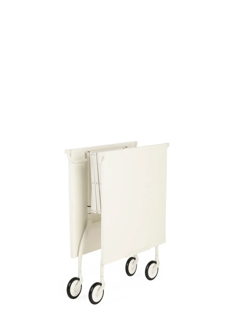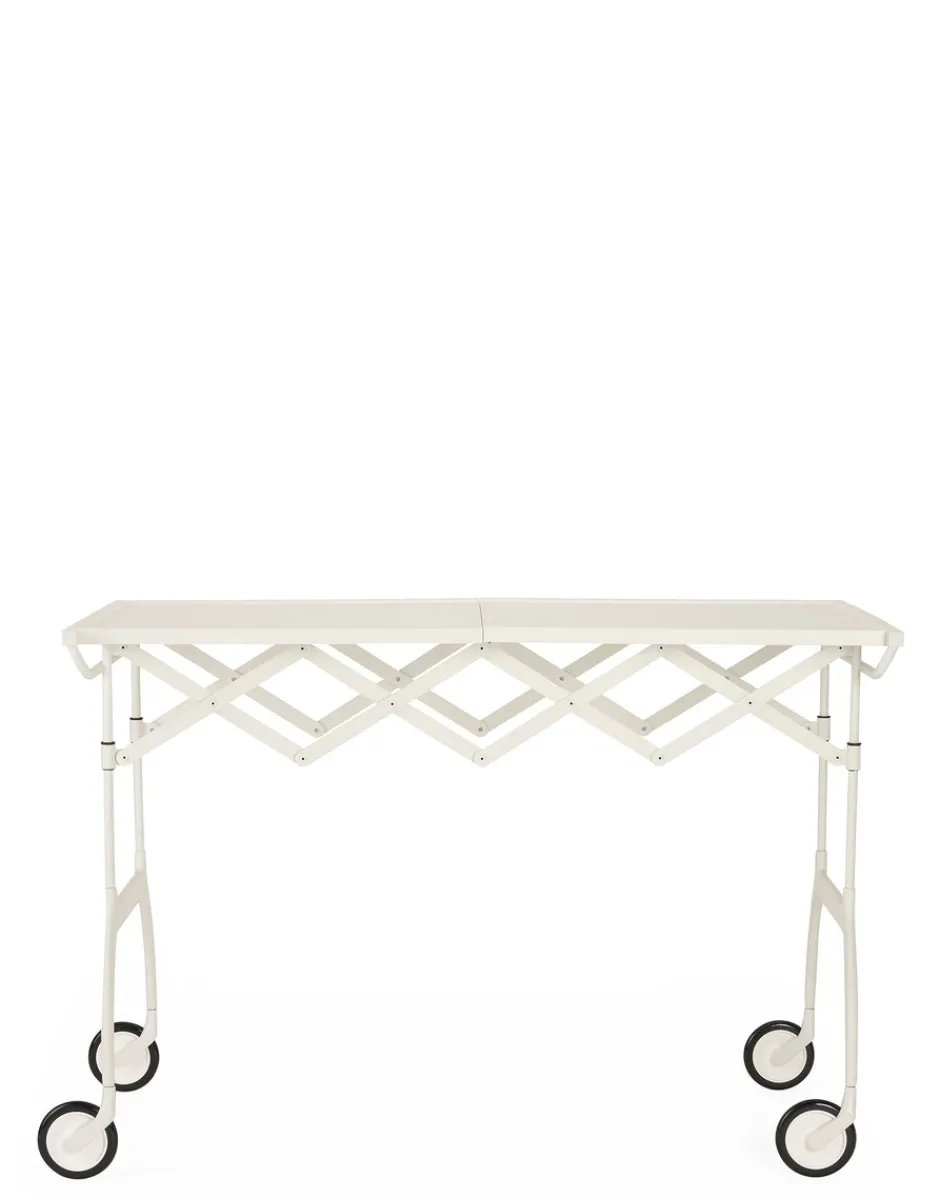 Battista, oltre ad essere un pratico carrello, caratterizzato dalla riuscita combinazione compositiva tra materiali plastici e metallo, si propone come vero e proprio tavolo allungabile e pieghevole ideale per buffet e aperitivi o come piccolo tavolo da appoggio.