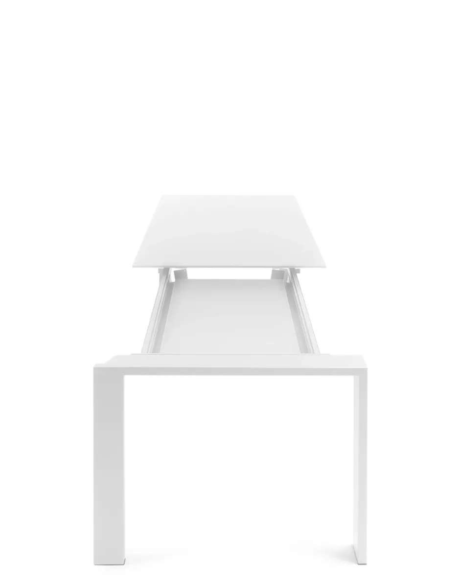 La famiglia di tavoli FOUR di Ferruccio Laviani rappresenta un connubio perfetto tra raffinatezza e funzionalità, caratterizzata da un design rigoroso e geometrico. Con un piano sottile e gambe asimmetriche, questi tavoli si distinguono per la loro eleganza e originalità. Oggi, questa linea viene proposta in una nuova variante allungabile, che consente di adattarsi con versatilità a ogni ambiente. Grazie a questa innovazione proposta da Kartell, i tavoli FOUR diventano ancora più adatti alle esigenze dinamiche degli spazi contemporanei, offrendo una soluzione pratica e stilisticamente perfetta per riunioni, cene e momenti conviviali. I tavoli sono proposti nelle versioni con gambe in acciaio verniciato con piano laminato in finitura soft touch con lunghezza 160+50+50.