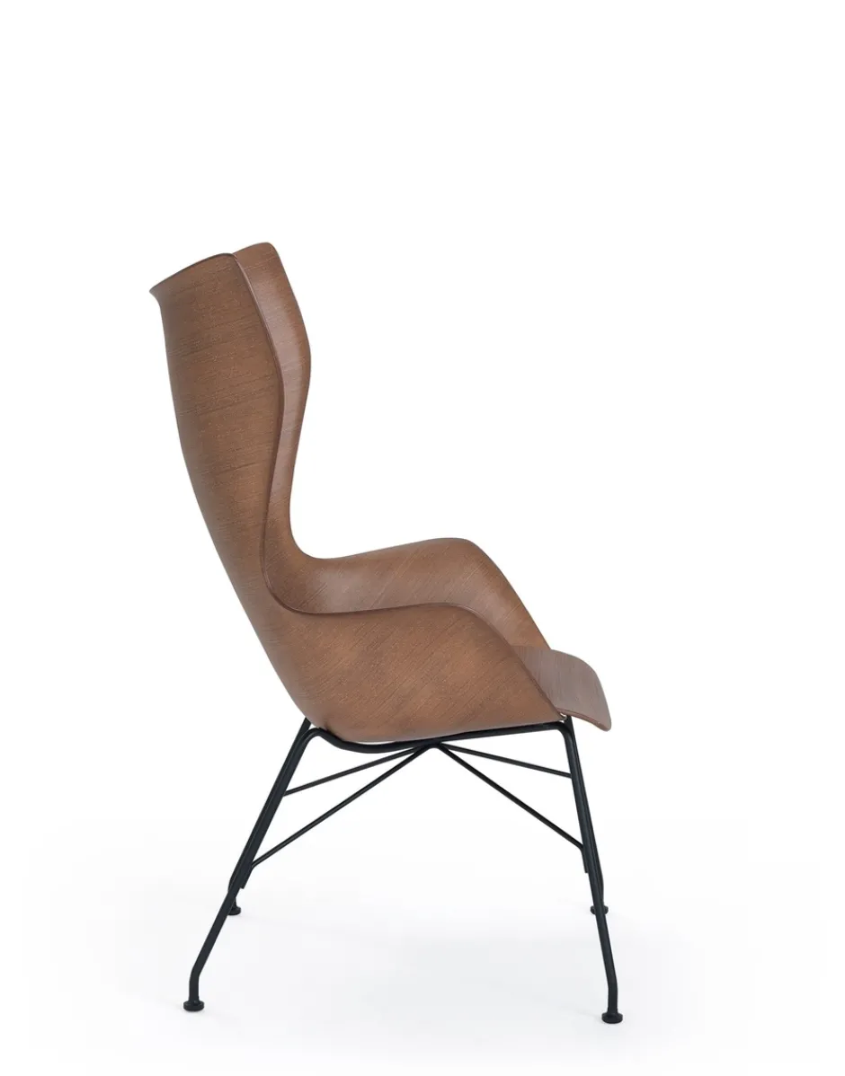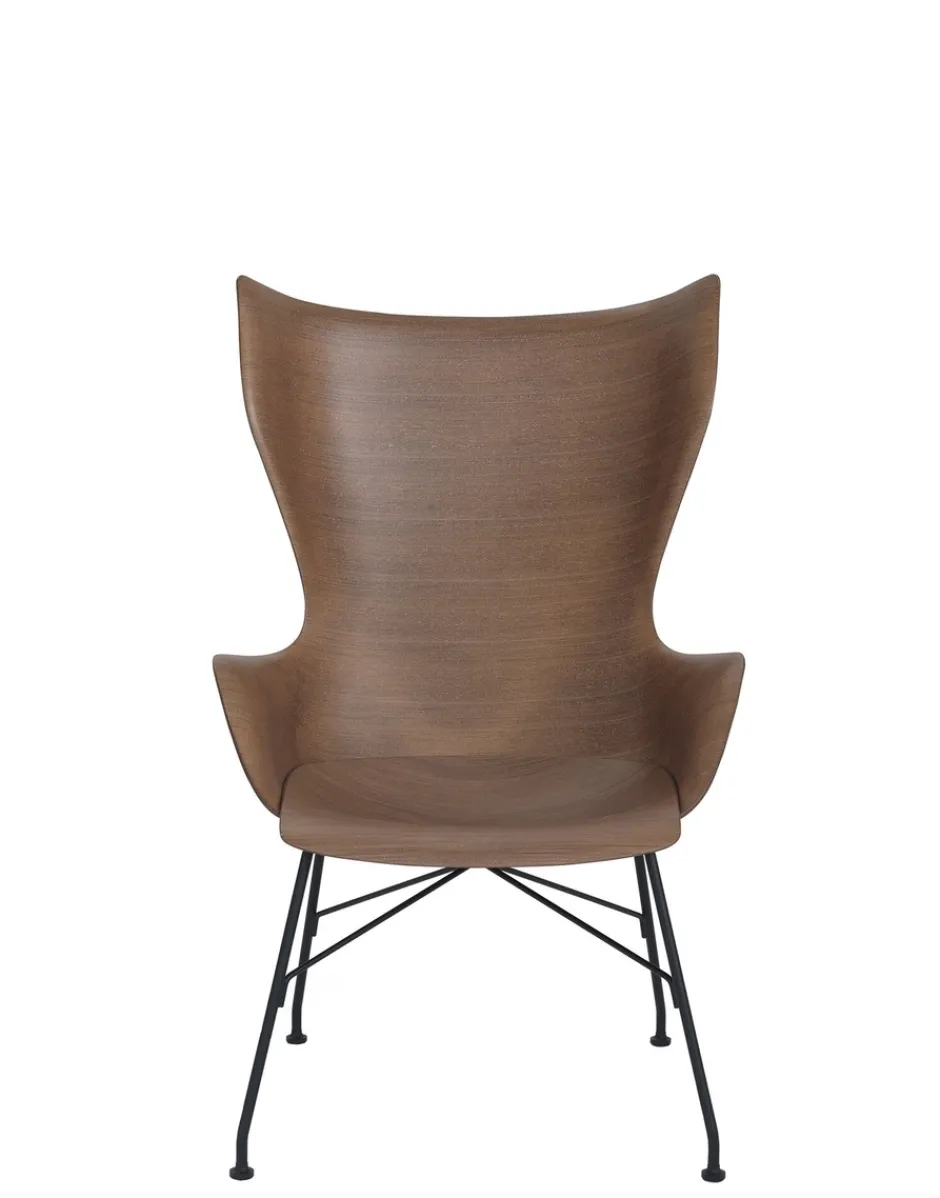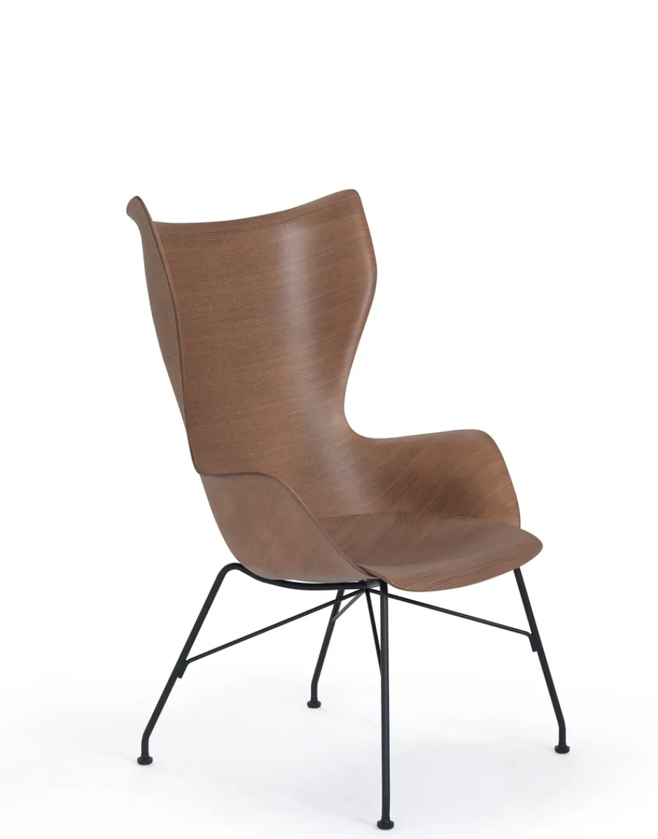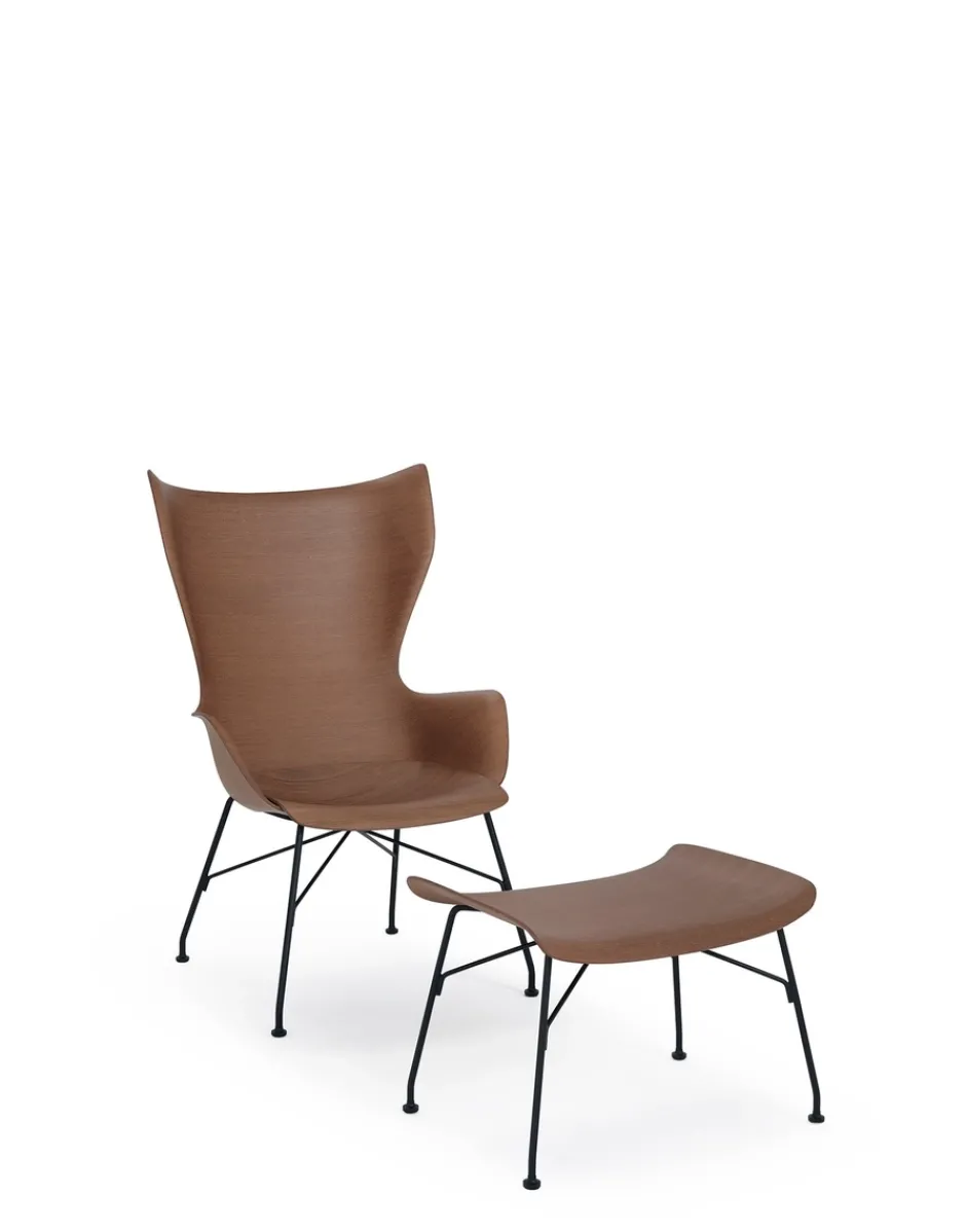 La collezione Smart Wood nasce dalla continua ricerca, che ha portato Kartell a dare tridimensionalità a un prodotto che fino ad oggi è stato bidimensionale. Attraverso uno speciale brevetto, infatti, il legno viene lavorato con uno stampo in grado di portare al limite la curvatura del pannello e creare la scocca della seduta con rotondità sinuose. K/Wood è la poltrona in stile royal e completata da S/wood, un poggiapiedi coordinato con le stesse finiture.