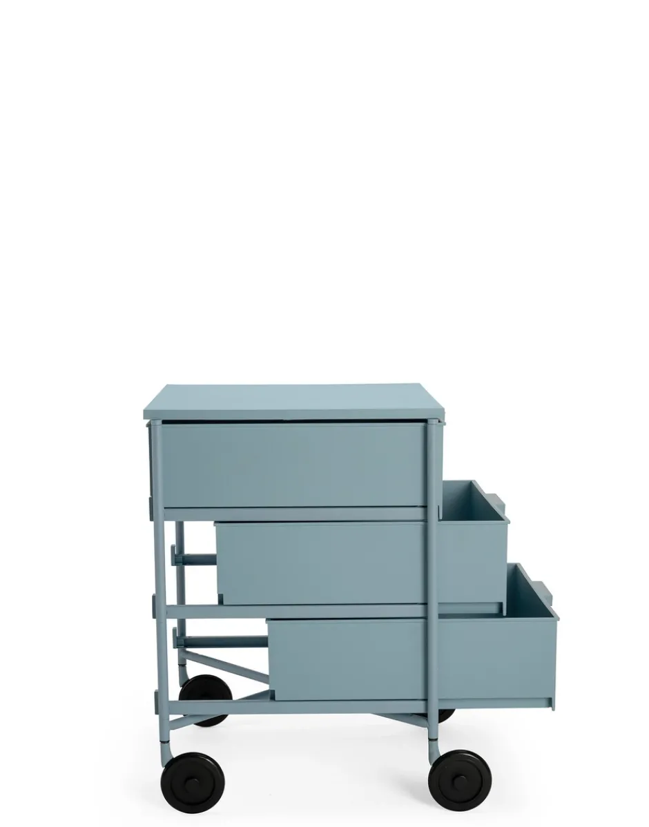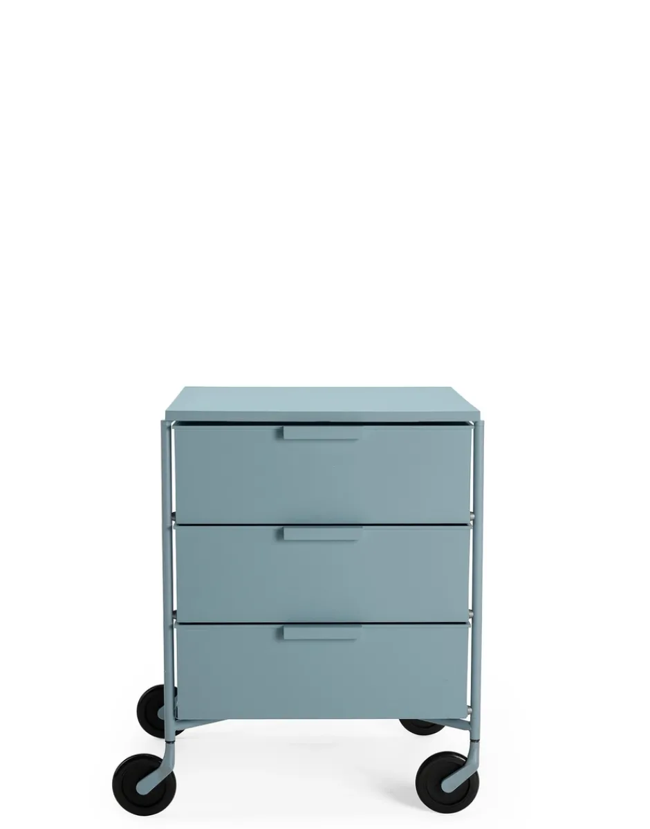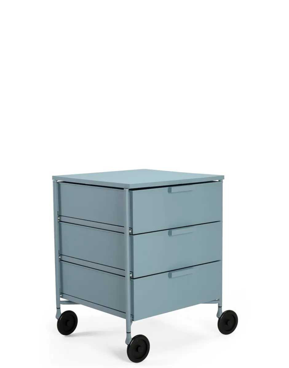 Vincitrice del Compasso d’Oro nel 1994, la cassettiera Mobil viene presentata in versione mat nei colori bianco, nero, verde, prugna e azzurro. La nuova edizione è in materiale riciclato derivante da scarti industriali e conserva le medesime caratteristiche di resistenza e funzionalità della versione originale. L’elemento base del sistema è il cassetto, alternato ai piani e ai top superiori, collegati da una struttura in alluminio. In questa nuova finitura la struttura è colorata e sono colorate anche le ruote in nero non più grigie. Versatile nella sua funzione uscendo dall’uso office trova un suo impiego in tutti gli ambienti della casa, dalla camera da letto al soggiorno al bagno.