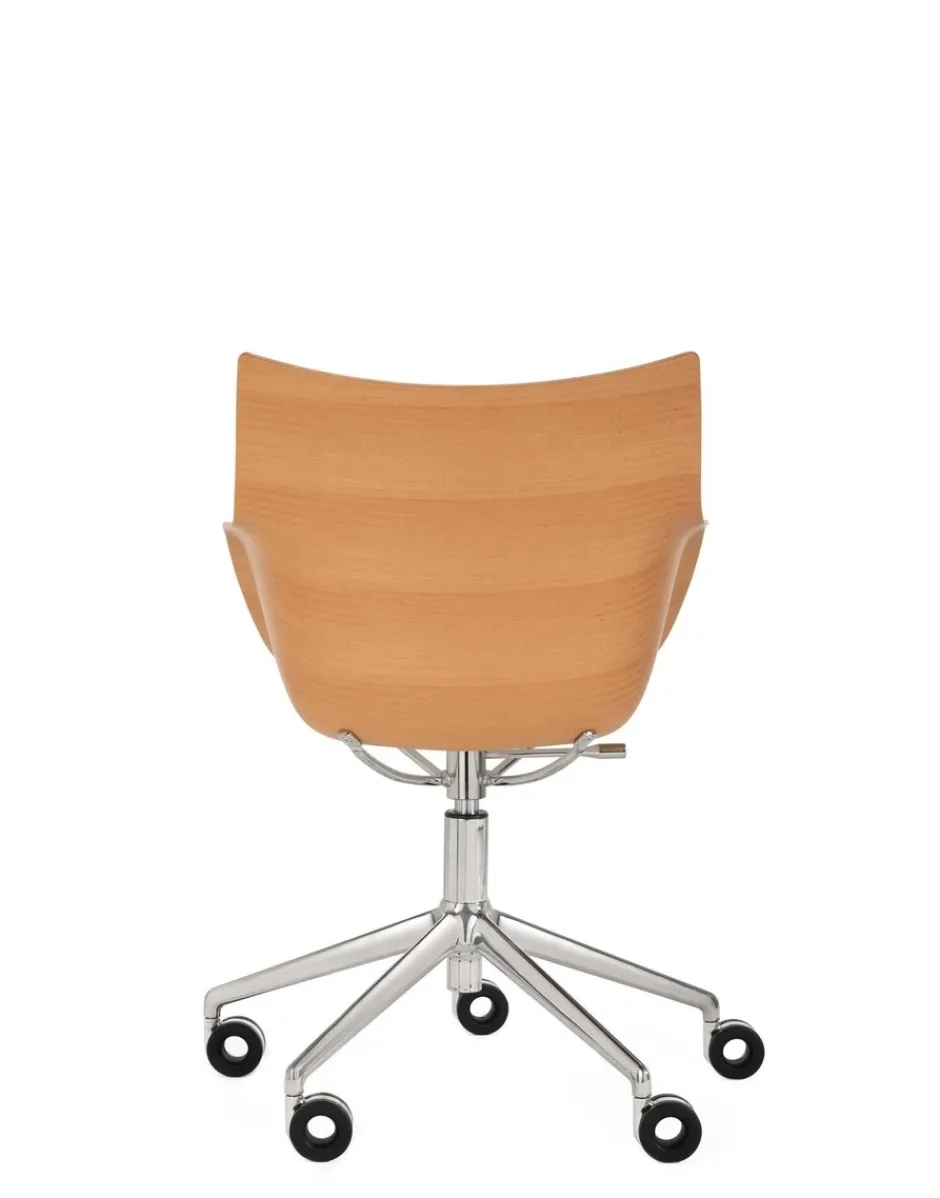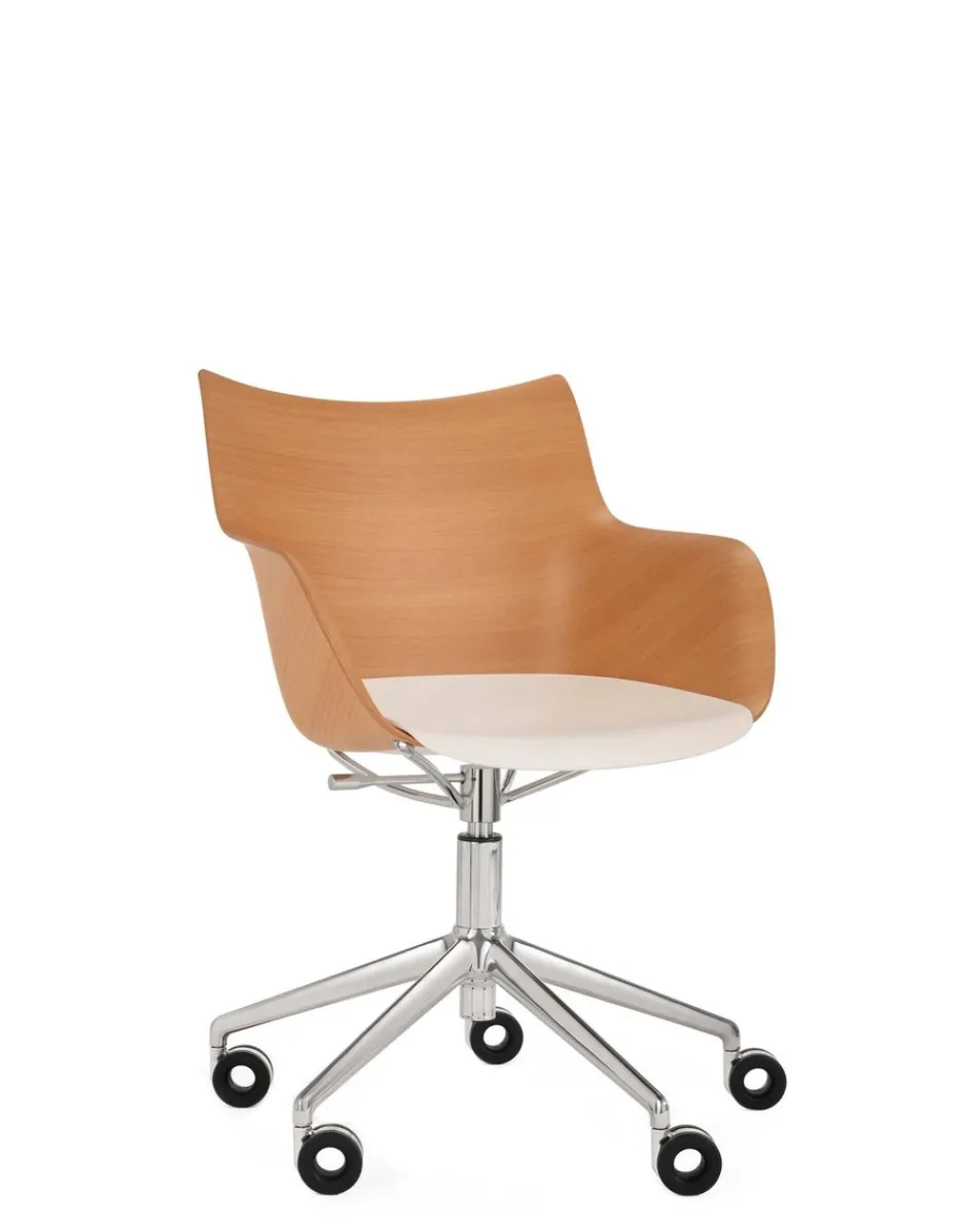 La famiglia di poltroncine si arricchisce della nuova versione girevole a rotelle. Q/wood è caratterizzata da una lavorazione unica del legno che unisce un’eleganza senza tempo a forme contemporanee ed è disponibile in tre varianti di colore: legno chiaro con seduta bianca e struttura cromo; legno scuro con seduta nera e struttura cromo e in legno scuro nero con struttura nera.