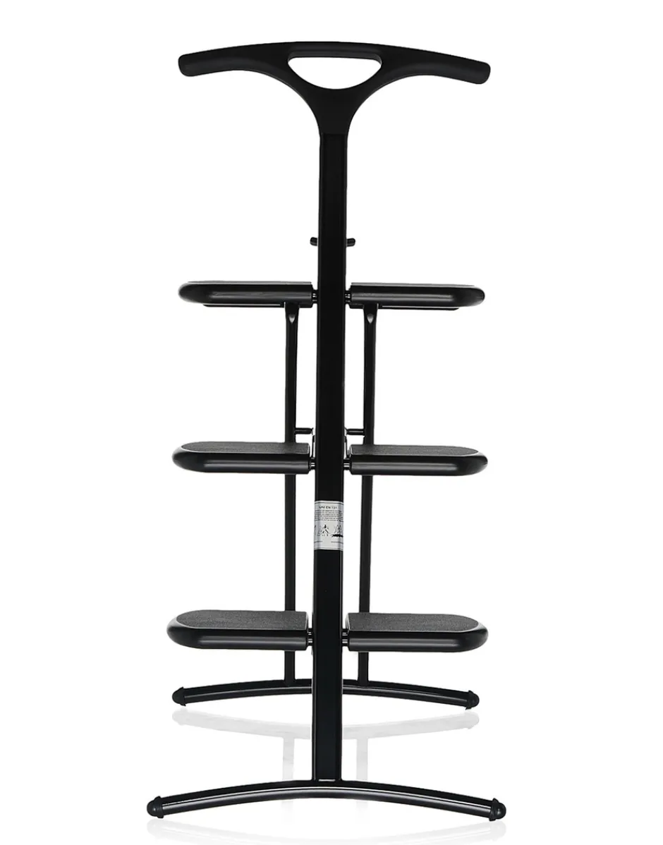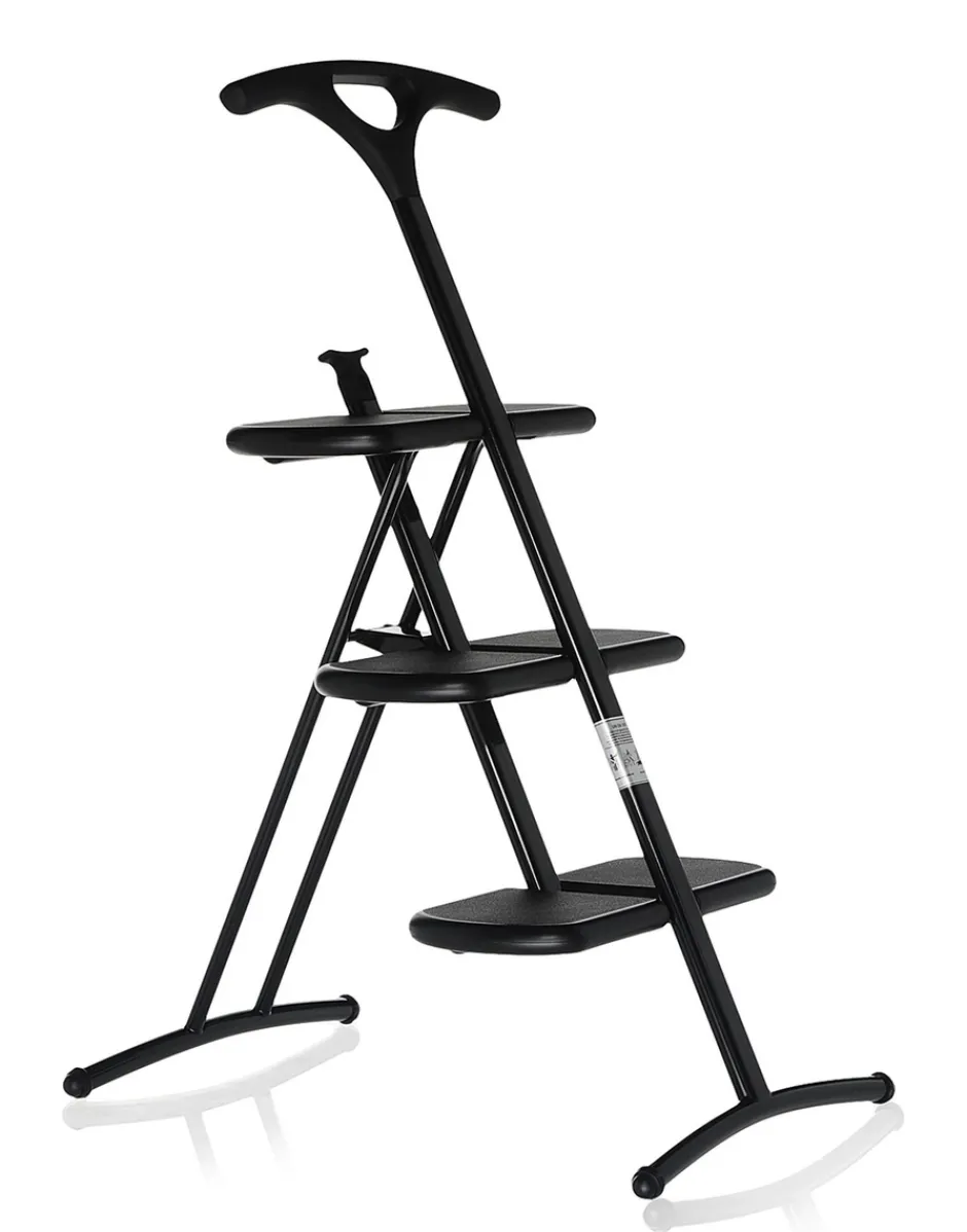 Una funzionale scaletta pieghevole a tre gradini con finitura antiscivolo. Tiramisù evidenzia la leggerezza del disegno nella struttura portante: le barre curvate offrono l’appoggio a terra e trovano nella maniglia non solo un robusto elemento di appoggio durante l‘uso, ma anche un pratico strumento funzionale una volta terminato l’utilizzo – grazie al suo design infatti è possibile agganciare Tiramisù a muro.