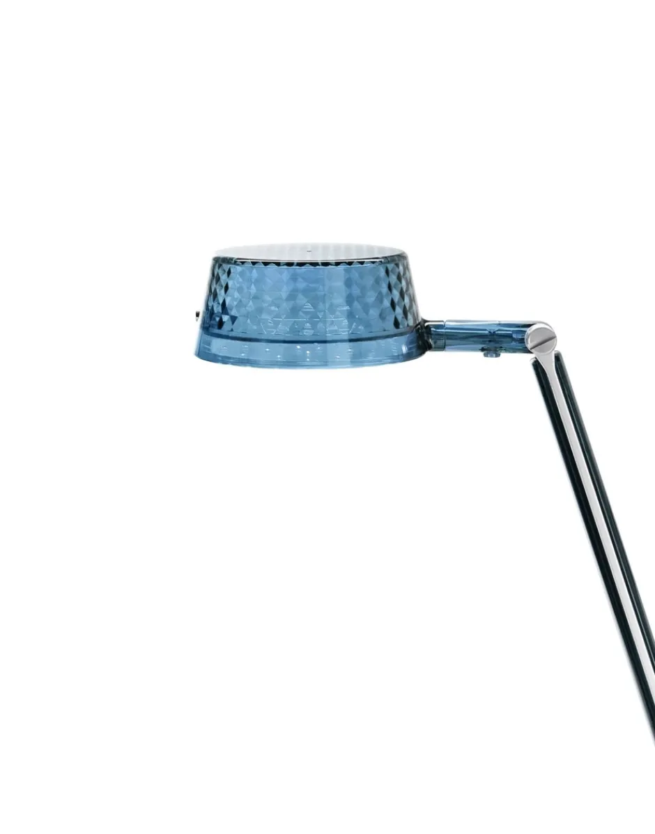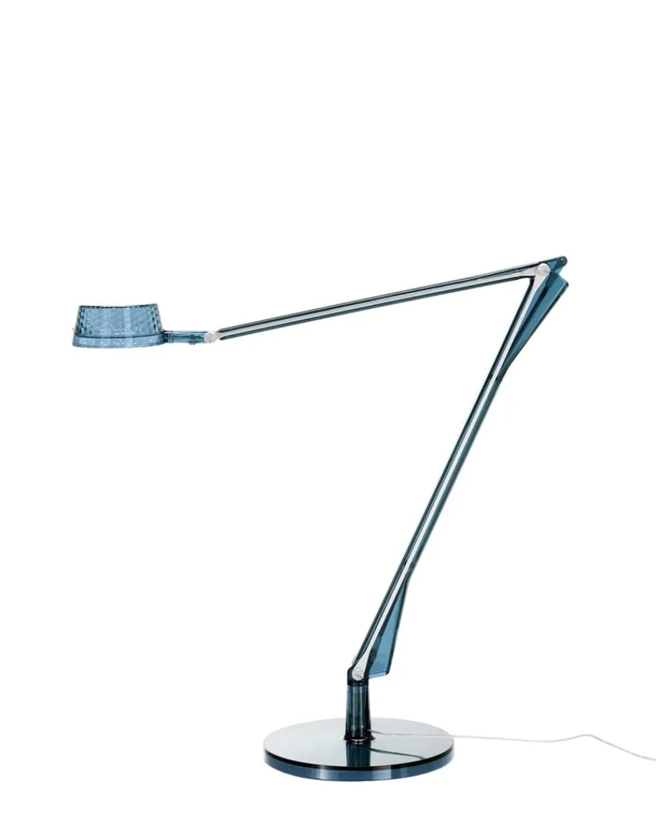 Aledin è una lampada da tavolo a led, disponibile in due diverse versioni, Tec e Dec, che si distinguono per il diffusore. Aledin Tec è caratterizzata da una testa piatta, che permette di ottenere un fascio luminoso diretto e al contempo orientabile, grazie alla possibilità di movimento del diffusore stesso. Per tali caratteristiche è più indicata per un utilizzo office, al contrario della versione Dec che si contraddistingue invece per la decorazione sfaccettata del diffusore a cono. Il fascio di luce risulta quindi più ampio e di atmosfera, ideale per un uso home. I due bracci snodati in policarbonato, che compongono la struttura di entrambi i modelli, si caratterizzano per la presenza di due stecche in alluminio, che assolvono alla funzione di conduttori. In classe 3, la lampada ha un’alta resa luminosa, circa 600lm con una potenza di 5.6W, che permette un forte risparmio energetico grazie a LED di ultima generazione.