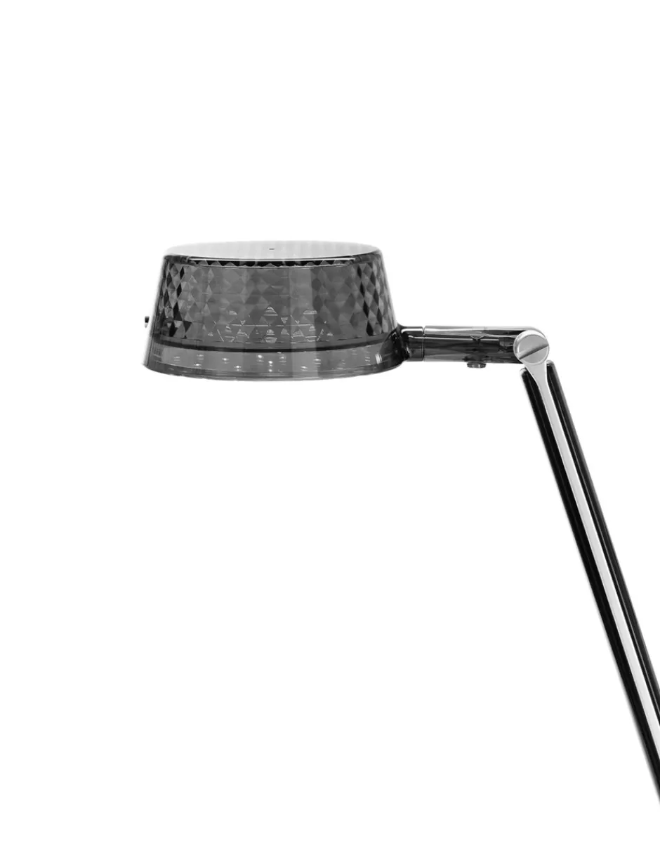 Aledin è una lampada da tavolo a led, disponibile in due diverse versioni, Tec e Dec, che si distinguono per il diffusore. Aledin Tec è caratterizzata da una testa piatta, che permette di ottenere un fascio luminoso diretto e al contempo orientabile, grazie alla possibilità di movimento del diffusore stesso. Per tali caratteristiche è più indicata per un utilizzo office, al contrario della versione Dec che si contraddistingue invece per la decorazione sfaccettata del diffusore a cono. Il fascio di luce risulta quindi più ampio e di atmosfera, ideale per un uso home. I due bracci snodati in policarbonato, che compongono la struttura di entrambi i modelli, si caratterizzano per la presenza di due stecche in alluminio, che assolvono alla funzione di conduttori. In classe 3, la lampada ha un’alta resa luminosa, circa 600lm con una potenza di 5.6W, che permette un forte risparmio energetico grazie a LED di ultima generazione.