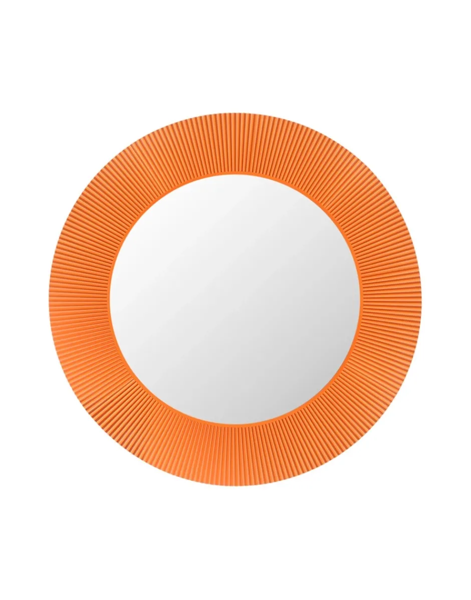 Specchio rotondo con una cornice trasparente o colorata, dal particolare effetto plissettato.