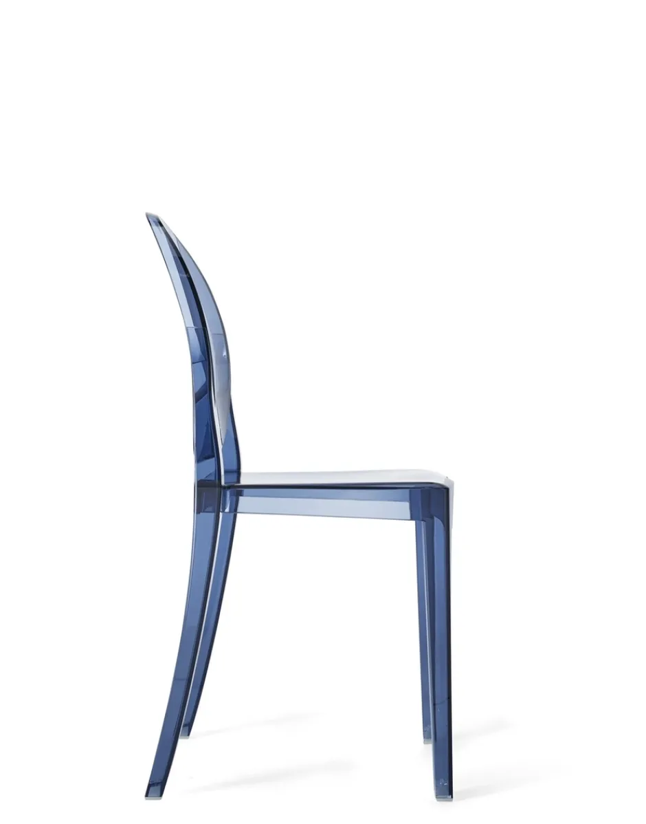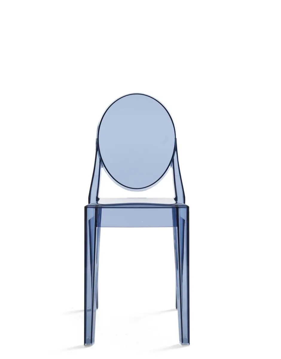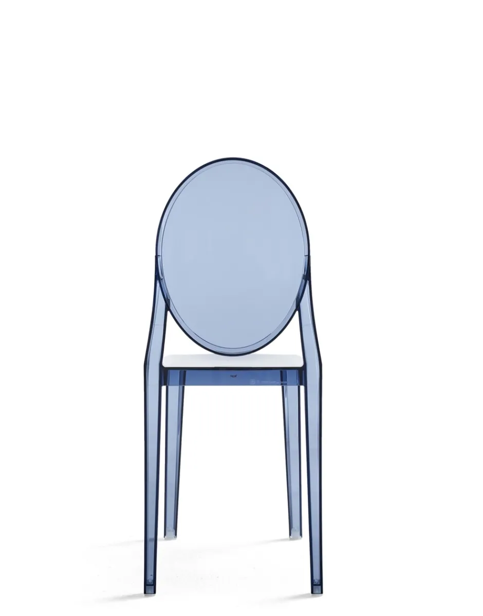 Una sedia nata da linee classiche, lo schienale è arrotondato e ricorda la forma degli antichi medaglioni mentre la seduta è lineare e geometrica. Victoria Ghost è in policarbonato trasparente o colorato ed è realizzata in un unico stampo ad iniezione. É stabile, confortevole, non teme urti ed è resistente agli agenti atmosferici. Un prodotto di grande carisma e personalità che si inserisce con eleganza e versatilità in ogni tipo di ambiente.