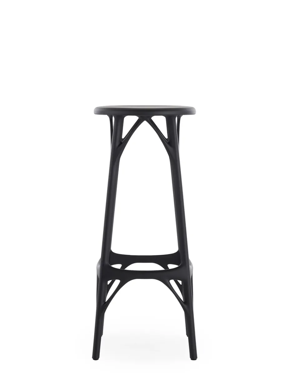 Uno sgabello in materiale riciclato che punta tutto sulla sostenibilità del progetto. La seduta è sostenibile sia dal punto di vista del materiale sia nel processo produttivo, appositamente pensato per la massima ottimizzazione: da un solo stampo si riescono infatti a produrre tre modelli, nell’ottica di un approccio green che arriva al cuore della produzione industriale.Il valore aggiunto di A.I. consiste nell’essere la prima famiglia di prodotti concepita dall’Intelligenza Artificiale che ha risposto agli input ricevuti dal designer (Philippe Starck) e al know-how dall’azienda (Kartell). Nello specifico, pensiero creativo, know-how aziendale e intelligenza artificiale si sono fuse per concepire un modello di sedia totalmente elaborato da un algoritmo che rispetta le richieste originali del designer e dell’azienda ovvero essere un prodotto, confortevole, che abbia i requisiti strutturali di resistenza e solidità richiesti, mantenendo anche uno dei valori principali di Kartell: essere un prodotto industriale stampato ad iniezione di grande qualità estetica.
