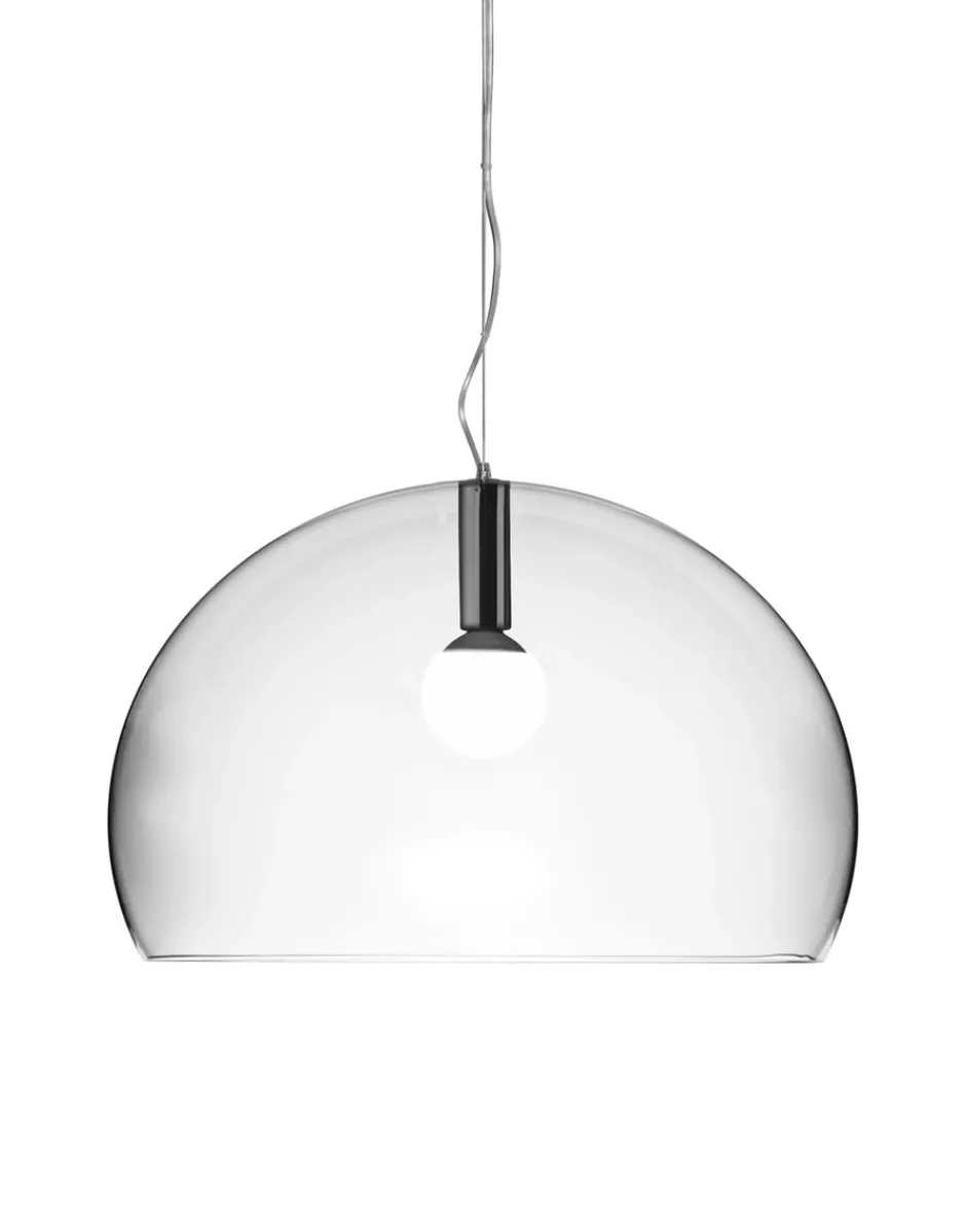 FL/Y è una lampada a sospensione dalle linee essenziali. La particolare trasparenza del materiale e la lucentezza dei colori richiama l’idea di una bolla di sapone, cangiante ai riflessi della luce. Inoltre la calotta non è perfettamente semisferica ma il piano secante è al di sotto dell’altezza del diametro per raccogliere maggiormente la luce. La lampada è proposta in tre diverse misure: Fl/Y (diametro 52cm, altezza diffusore 33cm), Small Fl/Y (diametro 38cm, altezza diffusore 28cm) e Big Fl/Y (diametro 83cm, altezza diffusore 55cm).