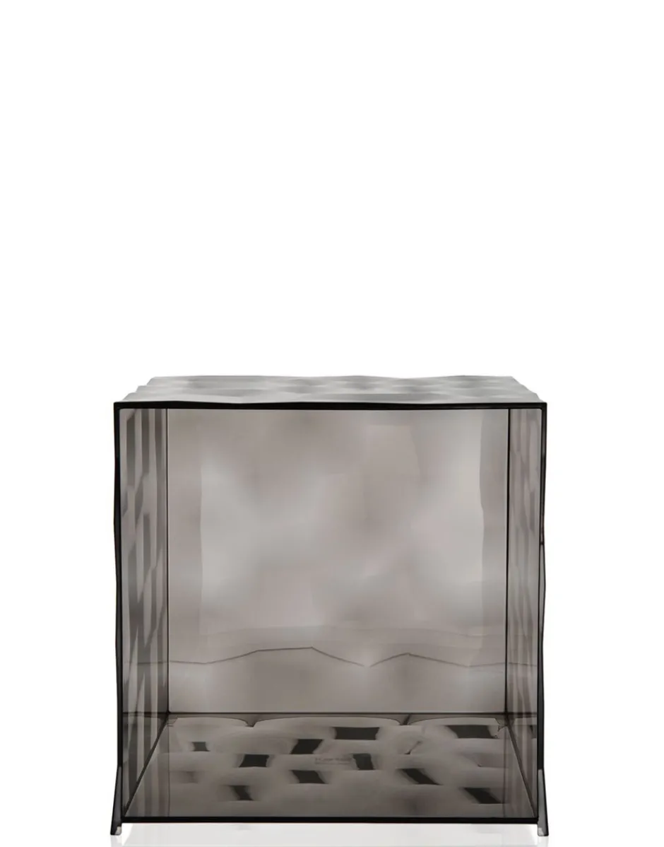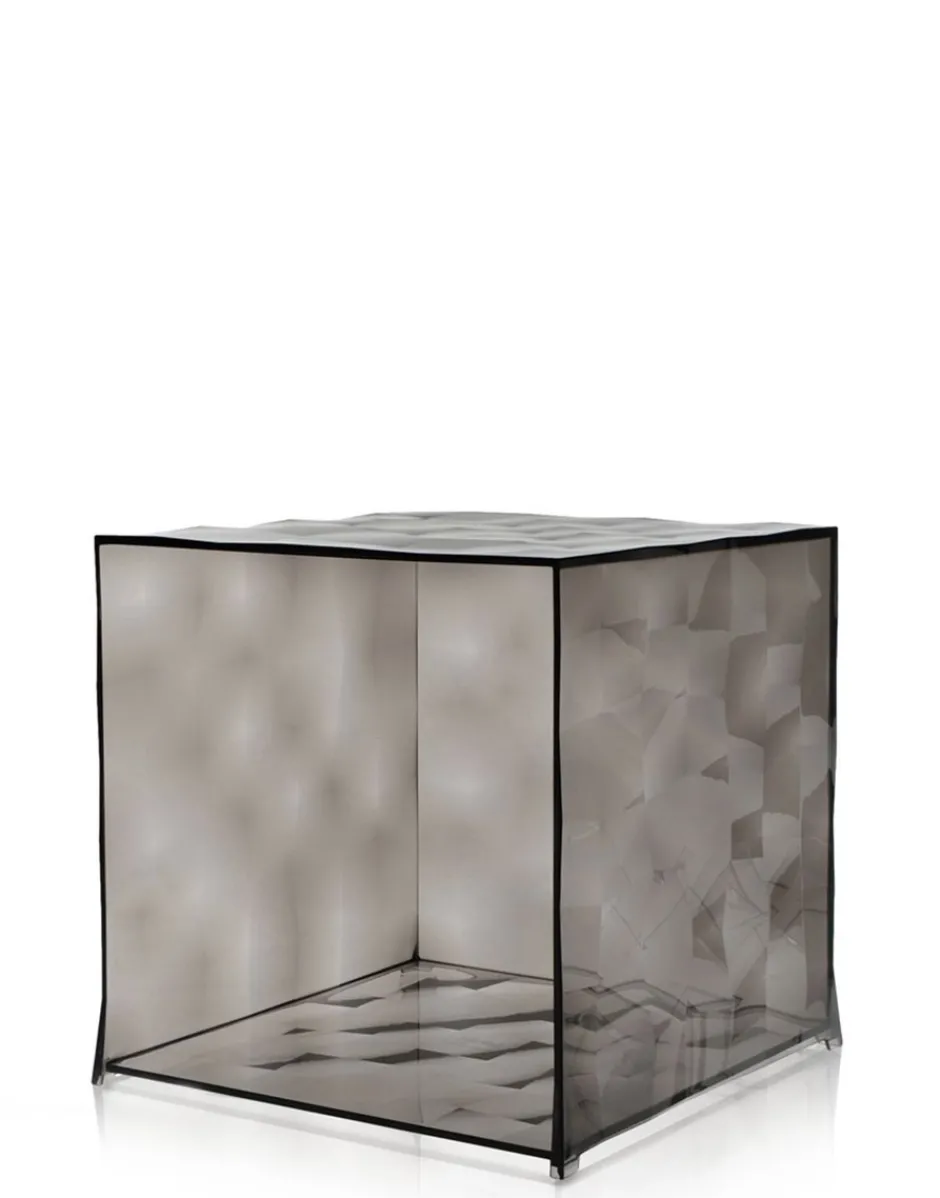 Optic è un cubo contenitore in due versioni, chiuso con antina o con un lato aperto, la superficie è decorata da piramidi a base quadrata, leggermente a rilievo che, con la superficie specchiante o trasparente, creano un effetto ottico di grande impatto.