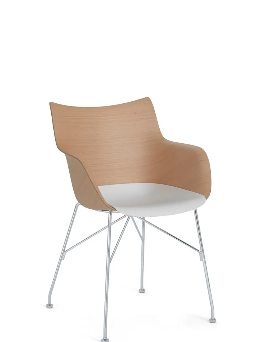 Q/Wood è la poltroncina della collezione Smart Wood le cui linee avvolgenti creano morbidi braccioli per il massimo comfort della seduta. Attraverso uno speciale brevetto, infatti, il legno viene lavorato con uno stampo in grado di portare al limite la curvatura del pannello e creare la scocca della seduta con rotondità sinuose.