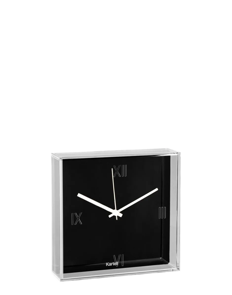 Una “scatola” quadrata trasparente, di misura 30×30 cm, con i numeri romani incisi sulla superficie che racchiude un quadrante piatto, su cui spicca una coppia di sottili lancette colorate, per una sintesi cromatica che trasforma il tempo in un’esperienza estetica.
