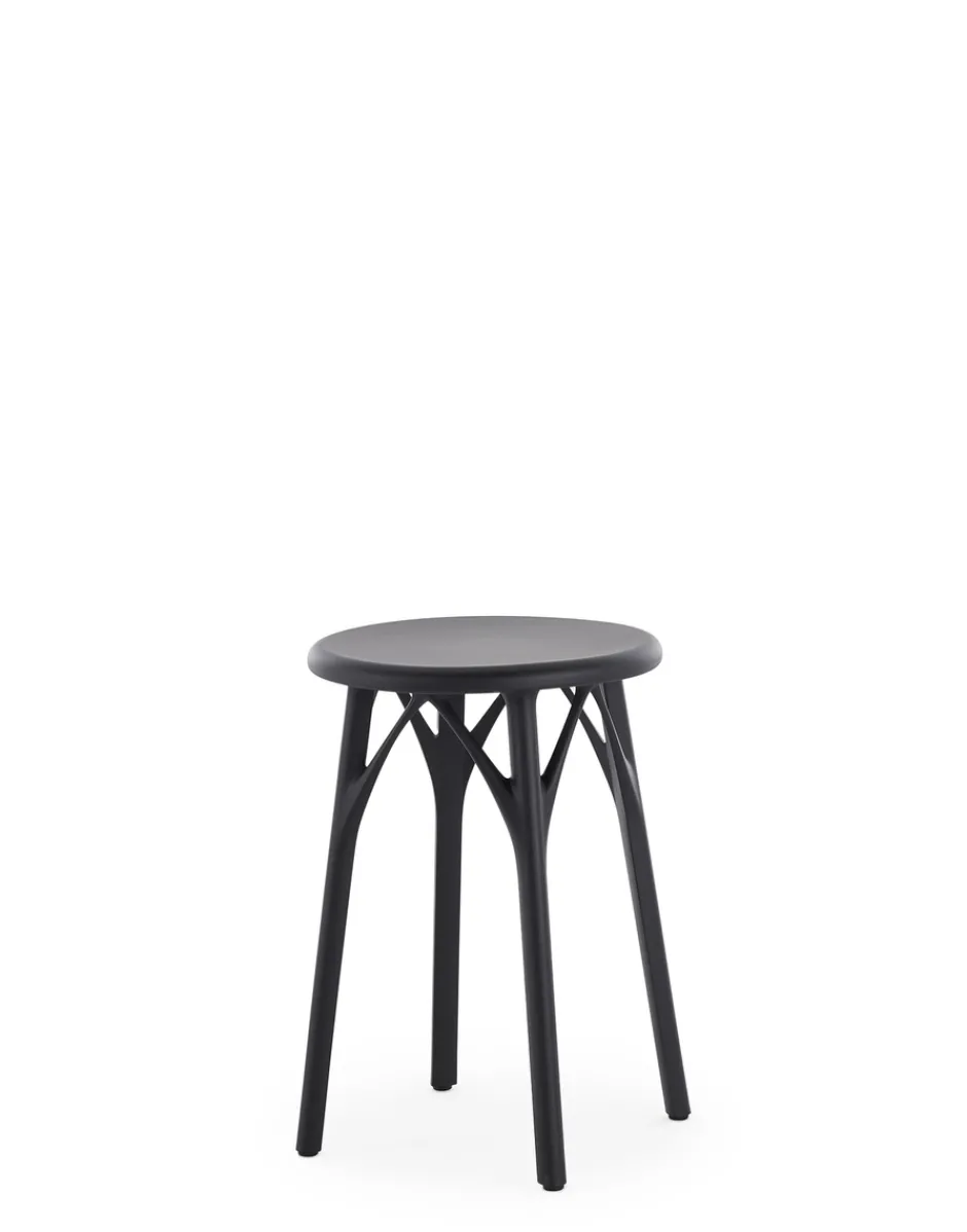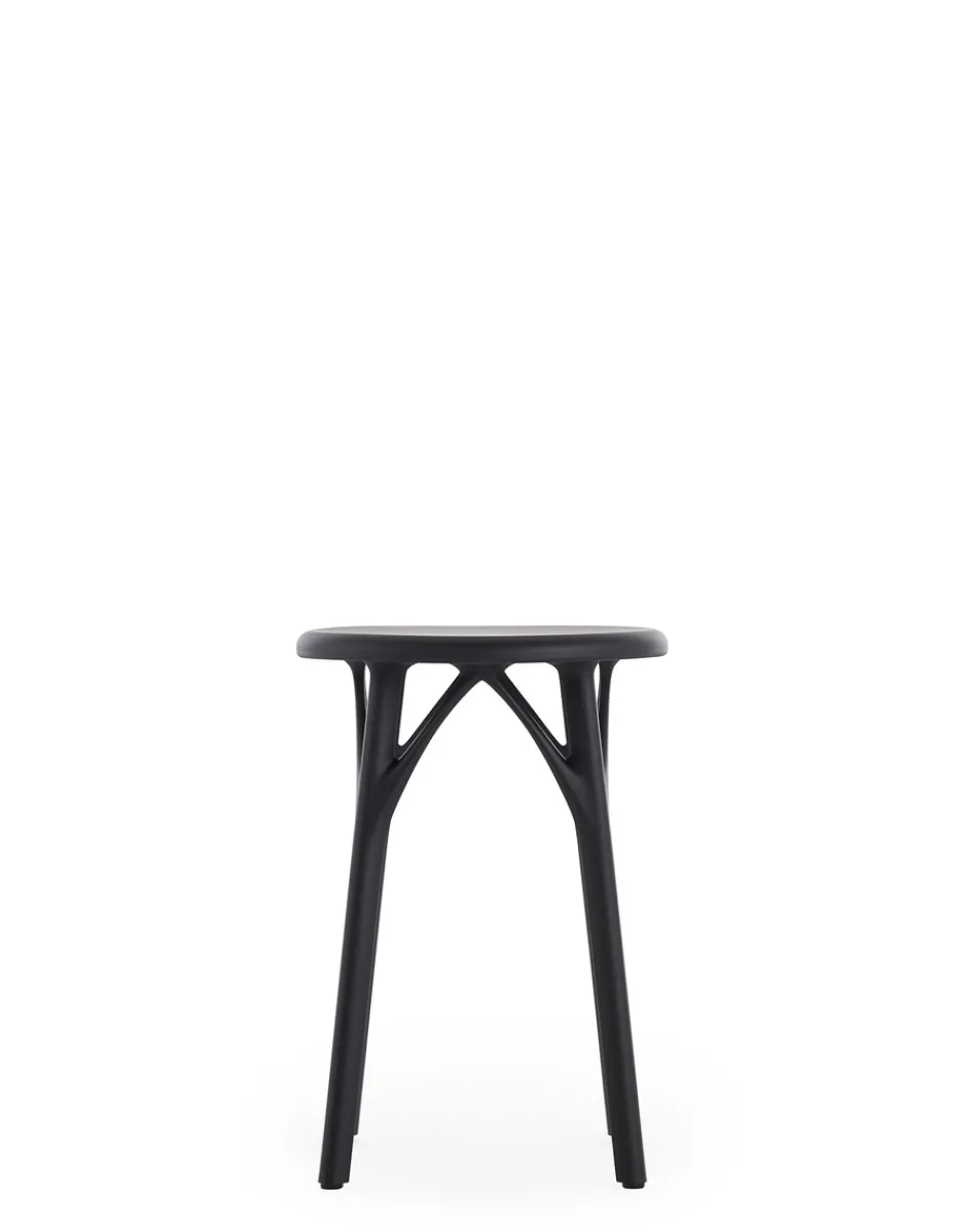 Uno sgabello in materiale riciclato che punta tutto sulla sostenibilità del progetto. La seduta è sostenibile sia dal punto di vista del materiale sia nel processo produttivo, appositamente pensato per la massima ottimizzazione: da un solo stampo si riescono infatti a produrre tre modelli, nell’ottica di un approccio green che arriva al cuore della produzione industriale.Il valore aggiunto di A.I. consiste nell’essere la prima famiglia di prodotti concepita dall’Intelligenza Artificiale che ha risposto agli input ricevuti dal designer (Philippe Starck) e al know-how dall’azienda (Kartell). Nello specifico, pensiero creativo, know-how aziendale e intelligenza artificiale si sono fuse per concepire un modello di sedia totalmente elaborato da un algoritmo che rispetta le richieste originali del designer e dell’azienda ovvero essere un prodotto, confortevole, che abbia i requisiti strutturali di resistenza e solidità richiesti, mantenendo anche uno dei valori principali di Kartell: essere un prodotto industriale stampato ad iniezione di grande qualità estetica.