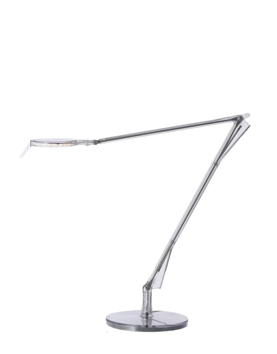Aledin è una lampada da tavolo a led, disponibile in due diverse versioni, Tec e Dec, che si distinguono per il diffusore. Aledin Tec è caratterizzata da una testa piatta, che permette di ottenere un fascio luminoso diretto e al contempo orientabile, grazie alla possibilità di movimento del diffusore stesso. Per tali caratteristiche è più indicata per un utilizzo office, al contrario della versione Dec che si contraddistingue invece per la decorazione sfaccettata del diffusore a cono. Il fascio di luce risulta quindi più ampio e di atmosfera, ideale per un uso home. I due bracci snodati in policarbonato, che compongono la struttura di entrambi i modelli, si caratterizzano per la presenza di due stecche in alluminio, che assolvono alla funzione di conduttori. In classe 3, la lampada ha un’alta resa luminosa, circa 600lm con una potenza di 5.6W, che permette un forte risparmio energetico grazie a LED di ultima generazione.