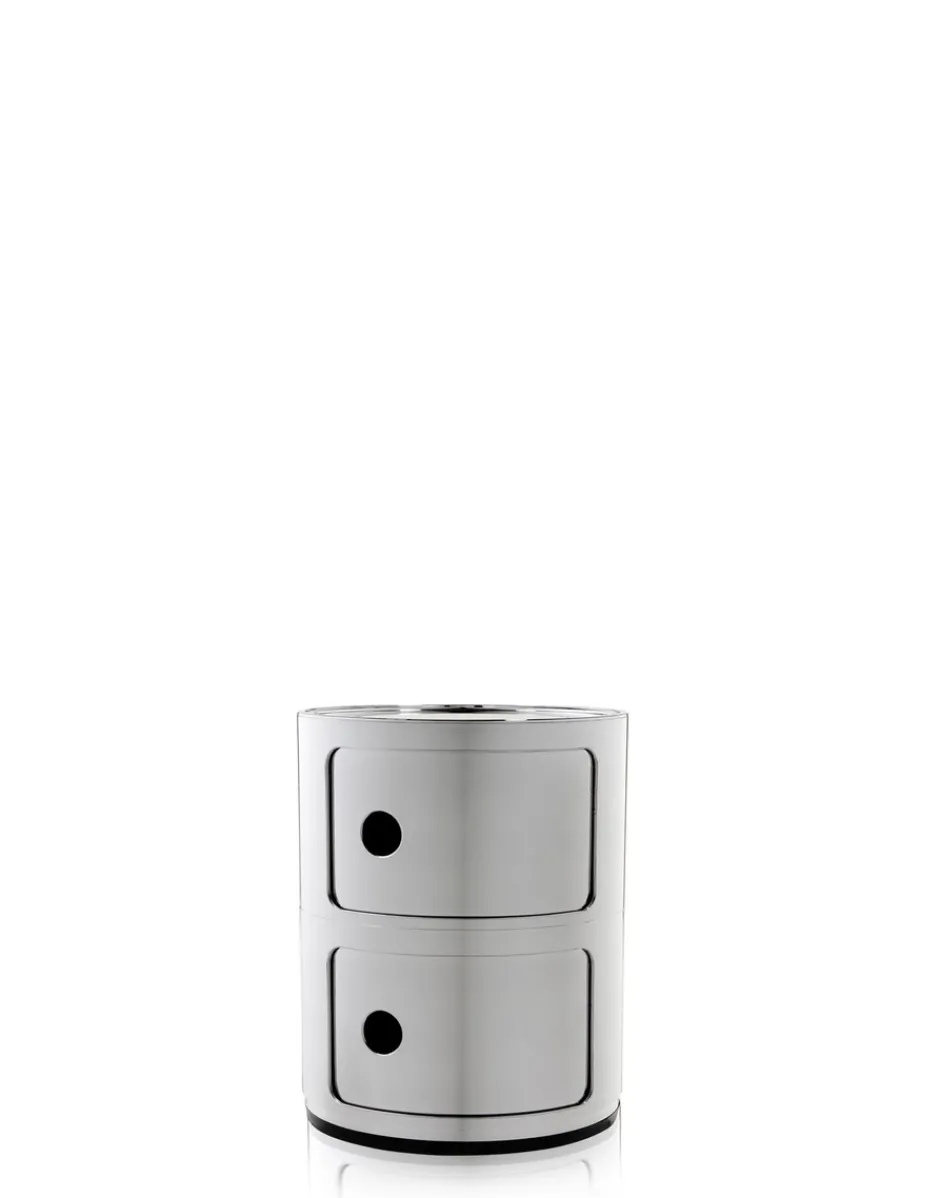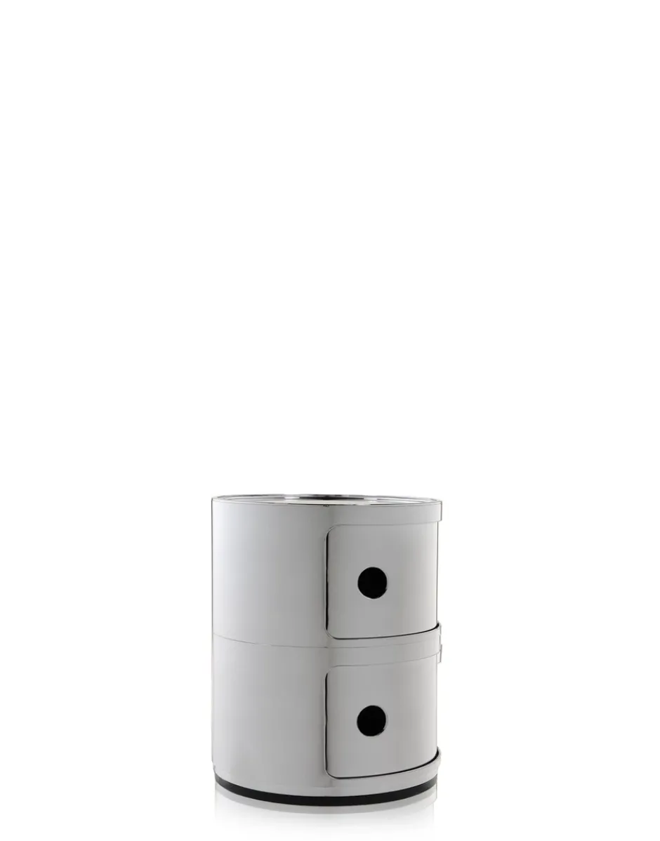 Gli elementi componibili sono stati progettati per rispondere a diverse esigenze d’uso e vivere in ogni ambiente della casa. I Componibili nati nel 1967 sono un classico senza tempo dell’arredamento, sono proposti oggi in forma rotonda con diametro da 32 cm in tre scintillanti finiture metal. Questo modello viene proposto in due composizioni fisse, da due e tre elemnti, non sovrapponibili.