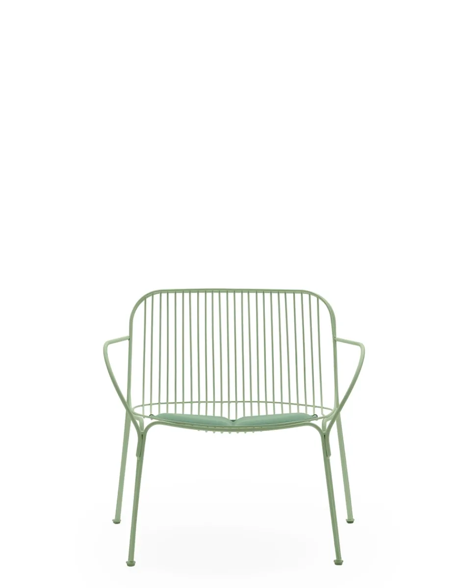 HIRAY gioca con il metallo, tra i materiali piùimportanti nella ridefinizione green del catalogo Kartell, lavorandolo con la tecnica del filo saldato. Il risultato è un segno essenziale e funzionalista e allo stesso tempo intriso di emozione. I fili di metallo disegnano pezzi dalla struttura ben definita ma leggera: sedia, sedia con braccioli, tavolino bistrot, poltrona, divano e side table. I colori della collezione sono bianco, bordeaux, nero e verde.