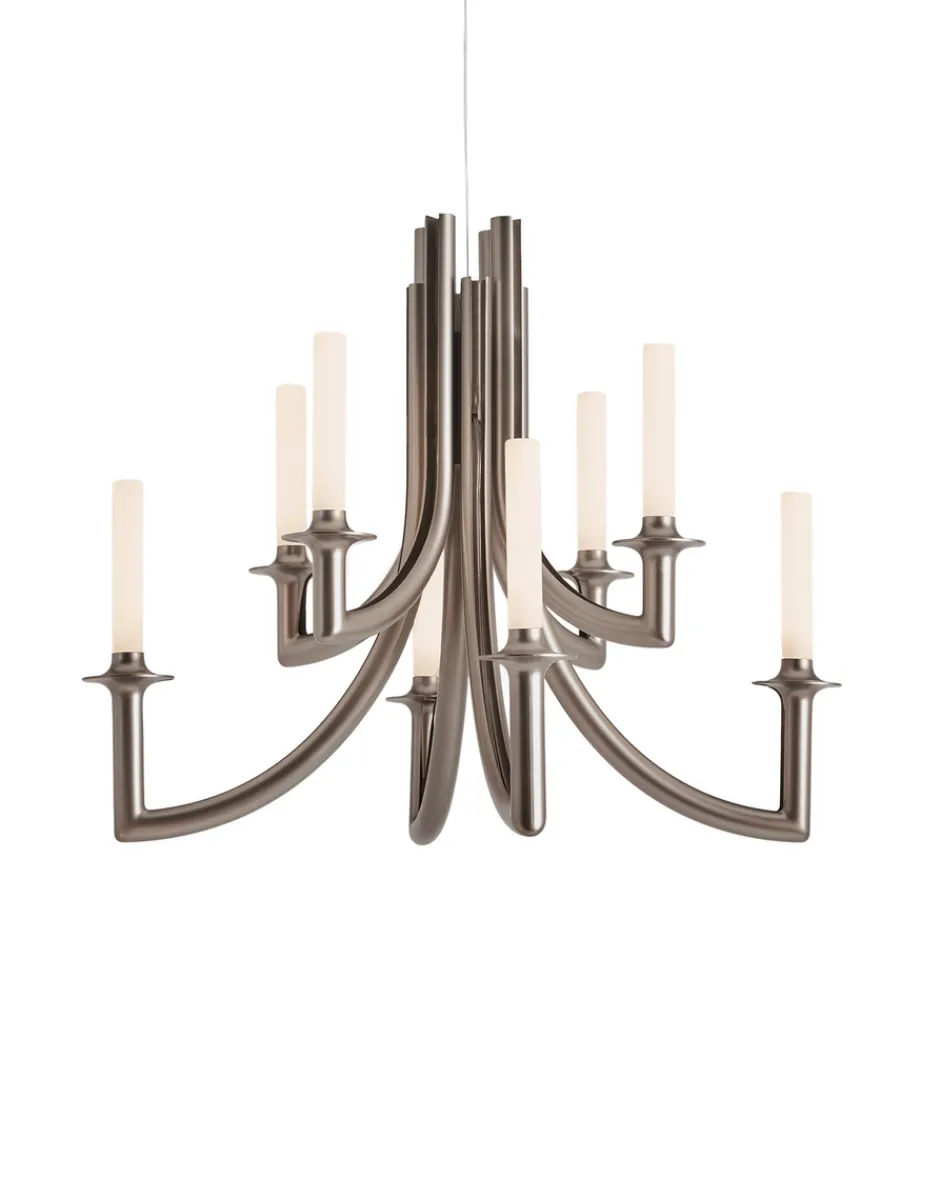 Lo chandelier KHAN di Philippe Starck l’incontro di stili, dall’eclettismo settecentesco al minimalismo contemporaneo, crea un nuovo stilema di eleganza e modernità. Il segno del design incontra l’innovazione tecnologica del nuovo policarbonato 2.0. nei colori nero, champagne e trasparente