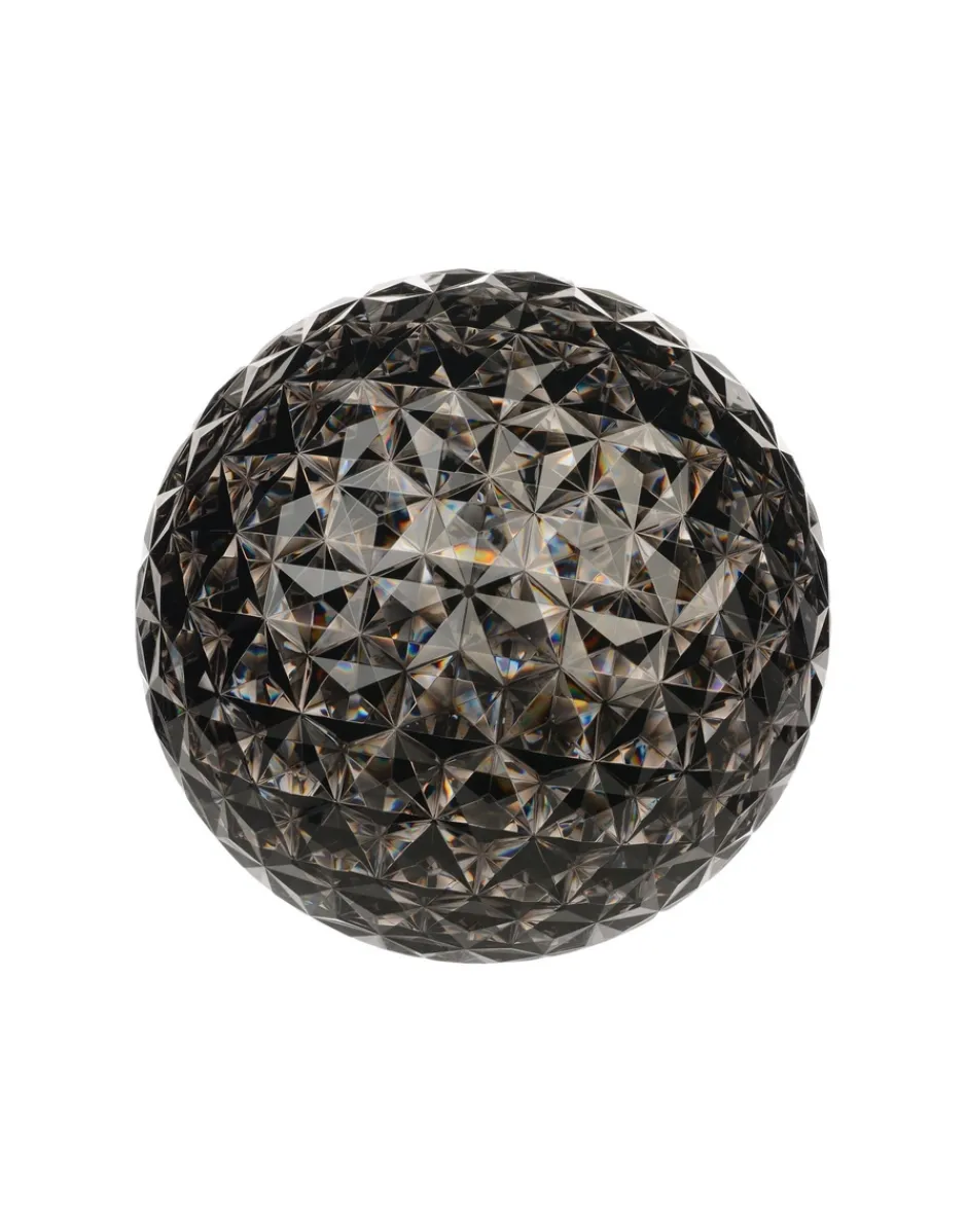 Una famiglia completa di lampade: a sospensione, da tavolo bassa e con struttura in metallo e la più recente versione da terra disponibile nelle due altezze 130 e 160 cm. La particolarità è data dalla forma leggermente ovoidale del diffusore trasparente, caratterizzato da una superficie sfaccettata sia nella parte interna sia esterna che crea un ricco gioco di riflessi.