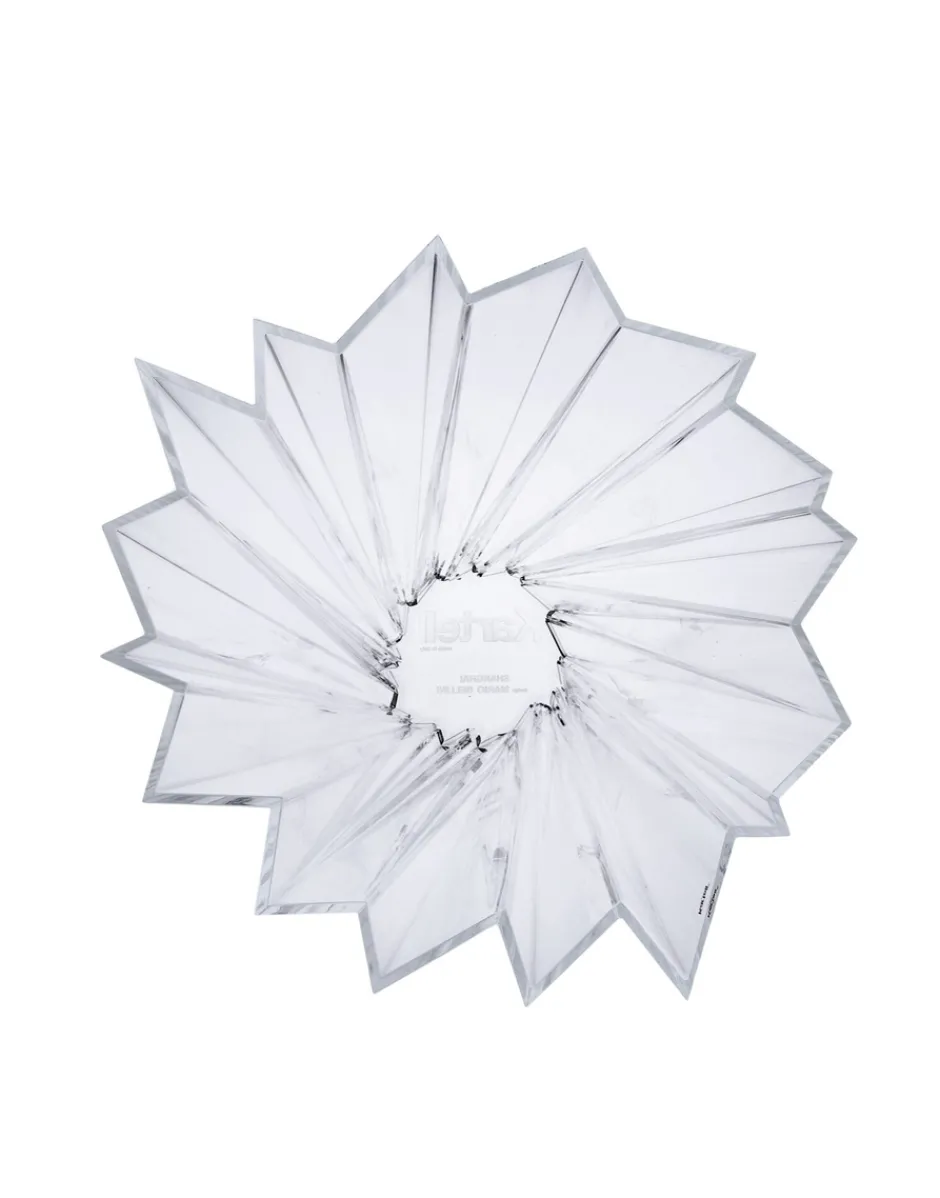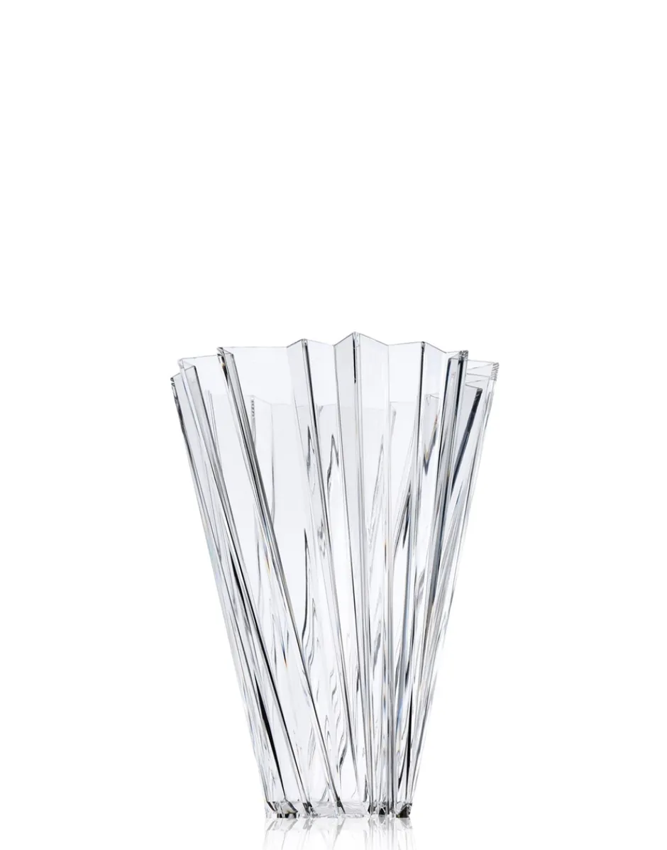 Un vaso sfaccettato, che si apre dalla base alla sommità come spinto da un movimento vorticoso dando vita a forme geometriche irregolari.