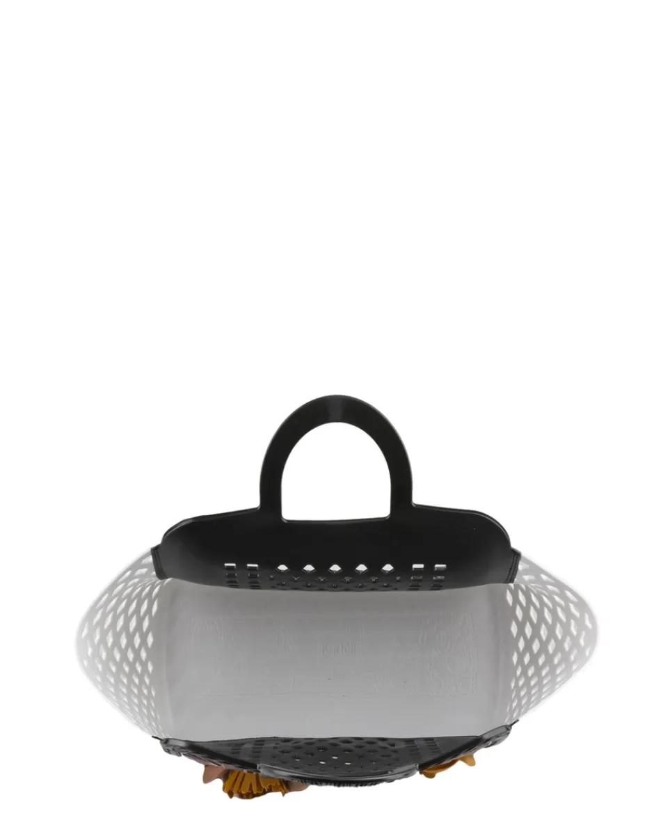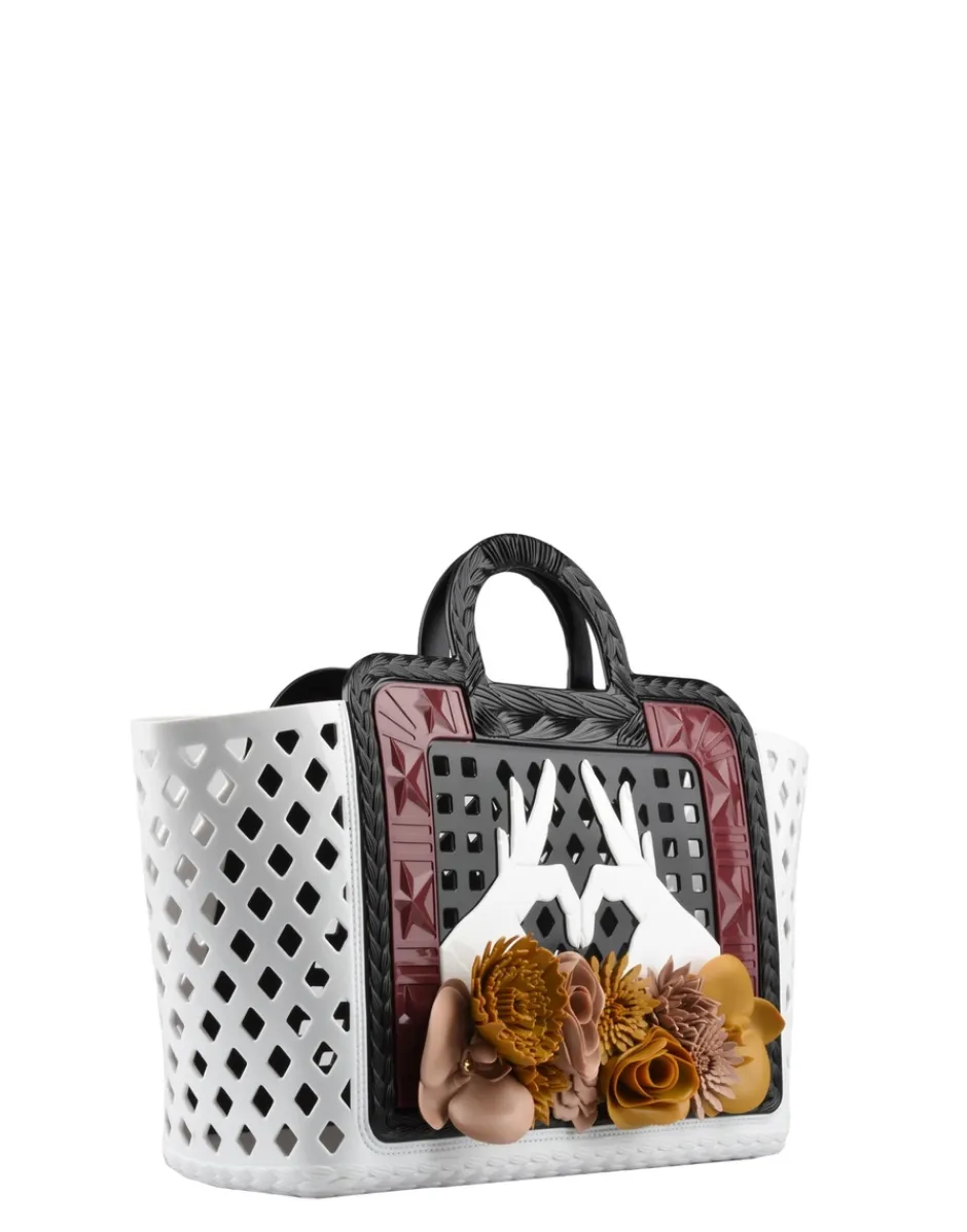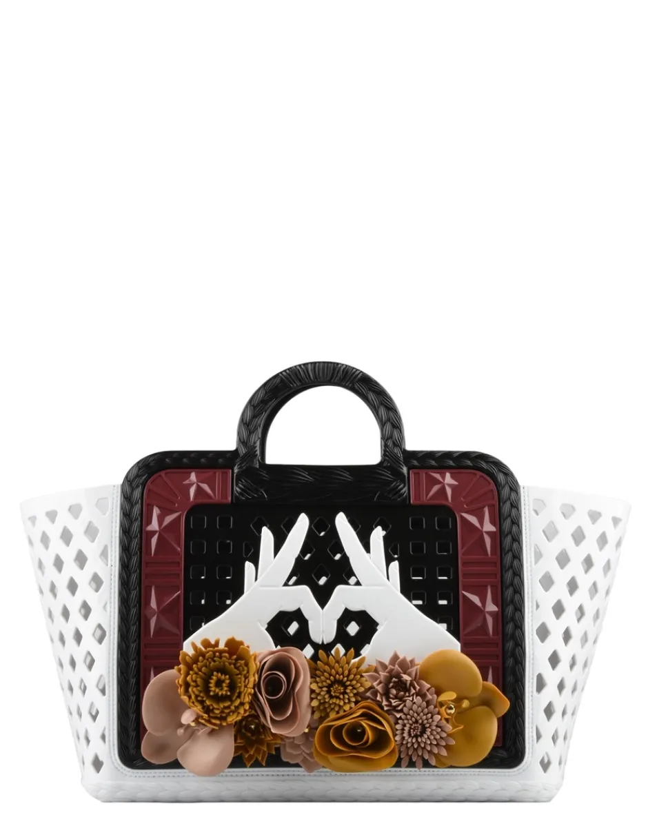 La borsa Parati è proposta in diverse combinazioni di colore. A lato, due mani unite a forma di cuore richiamano il tema dell’amore universale, mentre vere speciali riproduzioni di peonia, ranuncolo, orchidea, anemone e dalia di diverse forme e colori rimandano alle atmosfere lontane dei paesi esotici.