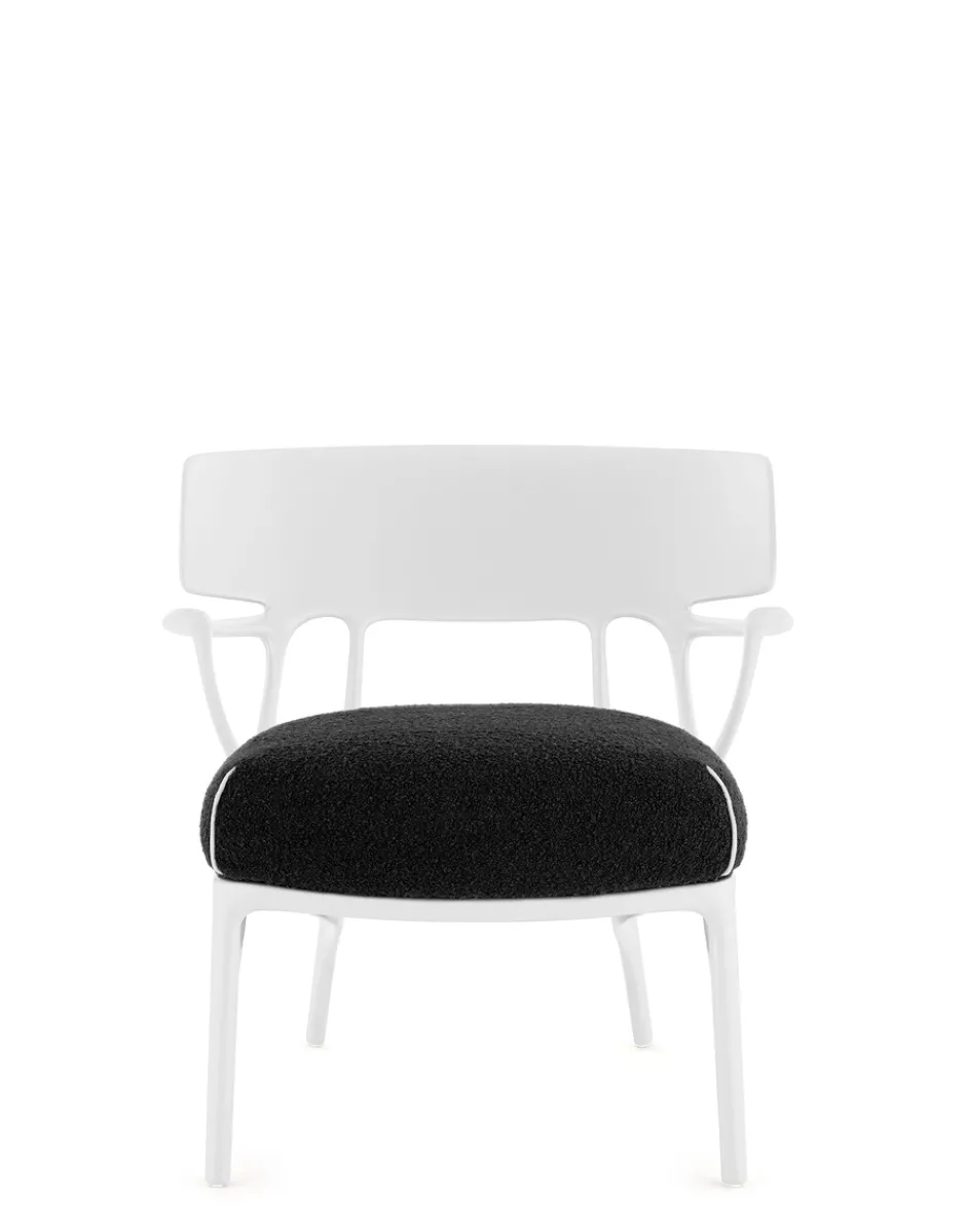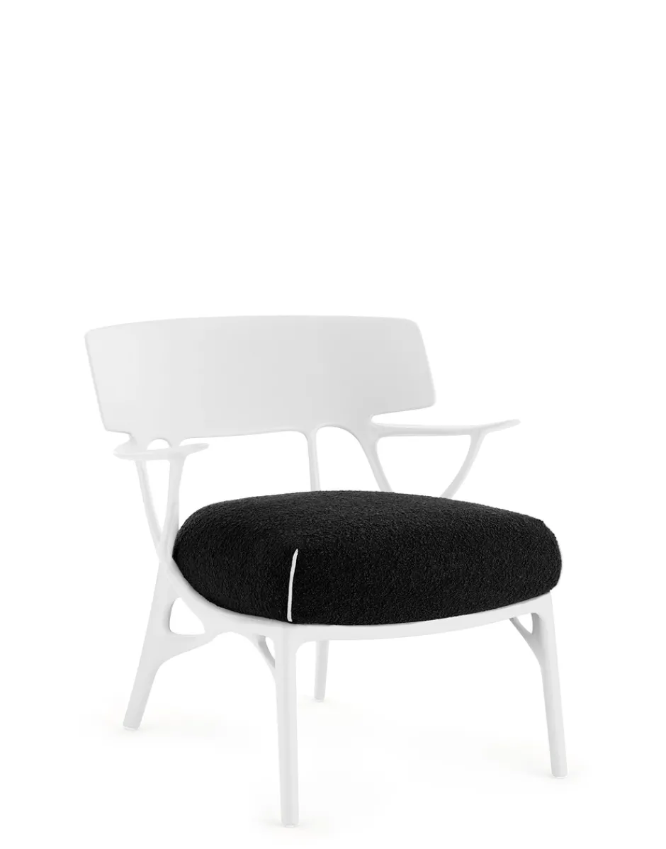 A.I. LOUNGE è la nuova poltrona della famiglia A.I. che coniuga materiali sostenibili e comfort con unsegno grafico che guarda al futuro e al benessere nei nostri luoghi dell’abitare. Una poltrona da salotto in cui lelinee, tratto distintivo della collezione, si mescolano alla massima comodità della seduta. Disponibile nei coloribianco, nero, arancio e grigio e nelle versioni con e senza cuscino per utilizzo indoor e outdoor.Il valore aggiunto di A.I. consiste nell’essere la prima famiglia di prodotti concepita dall’Intelligenza Artificiale che ha risposto agli input ricevuti dal designer (Philippe Starck) e al know-how dall’azienda (Kartell). Nello specifico, pensiero creativo, know-how aziendale e intelligenza artificiale si sono fuse per concepire un modello di sedia totalmente elaborato da un algoritmo che rispetta le richieste originali del designer e dell’azienda ovvero essere un prodotto, confortevole, che abbia i requisiti strutturali di resistenza e solidità richiesti, mantenendo anche uno dei valori principali di Kartell: essere un prodotto industriale stampato ad iniezione di grande qualità estetica.